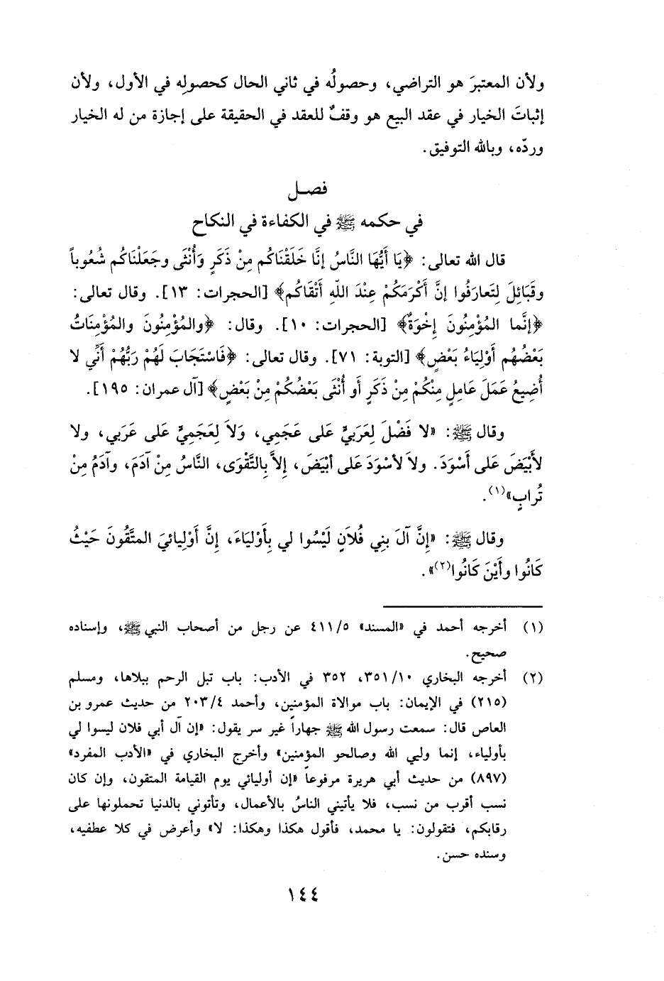 وَقَالَ صَلَّى اللَّهُ عَلَيْهِ وَسَلَّمَ: ( «لَا فَضْلَ لِعَرَبِيٍّ عَلَى عَجَمِيٍّ، وَلَا لِعَجَمِيٍّ عَلَى عَرَبِيٍّ، وَلَا لِأَبْيَضَ عَلَى أَسْوَدَ. وَلَا لِأَسْوَدَ عَلَى أَبْيَضَ إِلَّا بِالتَّقْوَى، النَّاسُ مِنْ آدَمَ، وَآدَمُ مِنْ تُرَابٍ» ) .