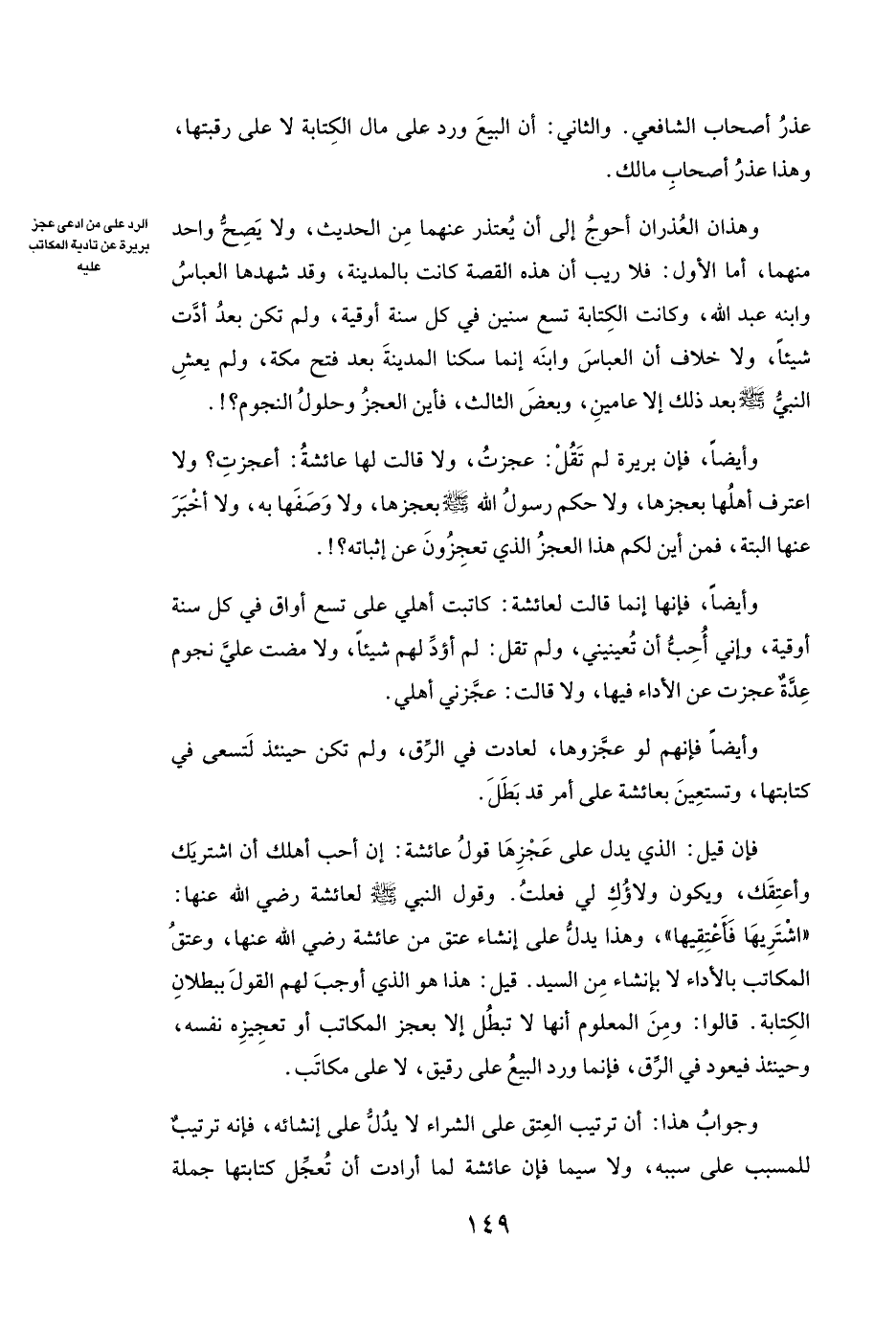 وَأَيْضًا، فَإِنَّ بريرة لَمْ تَقُلْ: عَجَزْتُ، وَلَا قَالَتْ لَهَا عائشة: أَعَجَزْتِ؟ وَلَا اعْتَرَفَ أَهْلُهَا بِعَجْزِهَا، وَلَا حَكَمَ رَسُولُ اللَّهِ صَلَّى اللَّهُ عَلَيْهِ وَسَلَّمَ بِعَجْزِهَا، وَلَا وَصَفَهَا بِهِ، وَلَا أَخْبَرَ عَنْهَا الْبَتَّةَ، فَمِنْ أَيْنَ لَكُمْ هَذَا الْعَجْزُ الَّذِي تَعْجِزُونَ عَنْ إِثْبَاتِهِ؟! .