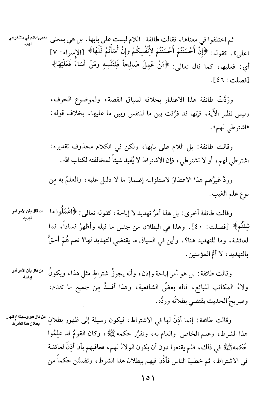 وَرَدَّتْ طَائِفَةٌ هَذَا الِاعْتِذَارَ بِخِلَافِهِ لِسِيَاقِ الْقِصَّةِ وَلِمَوْضُوعِ الْحَرْفِ، وَلَيْسَ نَظِيرَ الْآيَةِ، فَإِنَّهَا قَدْ فَرَّقَتْ بَيْنَ مَا لِلنَّفْسِ وَبَيْنَ مَا عَلَيْهَا بِخِلَافِ قَوْلِهِ: (اشْتَرِطِي لَهُمْ) .