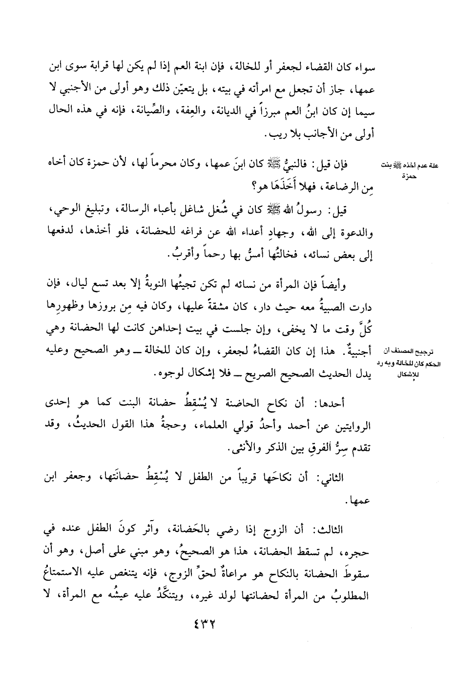 وَأَيْضًا فَإِنَّ الْمَرْأَةَ مِنْ نِسَائِهِ لَمْ تَكُنْ تَجِيئُهَا النَّوْبَةُ إِلَّا بَعْدَ تِسْعِ لَيَالٍ، فَإِنْ دَارَتِ الصَّبِيَّةُ مَعَهُ حَيْثُ دَارَ، كَانَ مَشَقَّةً عَلَيْهَا، وَكَانَ فِيهِ مِنْ بُرُوزِهَا وَظُهُورِهَا كُلَّ وَقْتٍ مَا لَا يَخْفَى، وَإِنْ جَلَسَتْ فِي بَيْتِ إِحْدَاهُنَّ كَانَتْ لَهَا الْحَضَانَةُ وَهِيَ أَجْنَبِيَّةٌ. هَذَا إِنْ كَانَ الْقَضَاءُ لجعفر وَإِنْ كَانَ لِلْخَالَةِ - وَهُوَ الصَّحِيحُ وَعَلَيْهِ يَدُلُّ الْحَدِيثُ الصَّحِيحُ الصَّرِيحُ - فَلَا إِشْكَالَ؛ لِوُجُوهٍ: