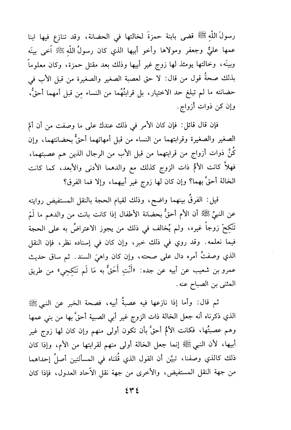 رَسُولَ اللَّهِ صَلَّى اللَّهُ عَلَيْهِ وَسَلَّمَ قَضَى بِابْنَةِ حمزة لِخَالَتِهَا فِي الْحَضَانَةِ، وَقَدْ تَنَازَعَ فِيهَا ابْنَا عَمِّهَا علي وجعفر وَمَوْلَاهَا وَأَخُو أَبِيهَا الَّذِي كَانَ رَسُولُ اللَّهِ صَلَّى اللَّهُ عَلَيْهِ وَسَلَّمَ آخَى بَيْنَهُ وَبَيْنَهُ، وَخَالَتُهَا يَوْمَئِذٍ لَهَا زَوْجٌ غَيْرُ أَبِيهَا، وَذَلِكَ بَعْدَ مَقْتَلِ حمزة وَكَانَ مَعْلُومًا بِذَلِكَ صِحَّةُ قَوْلِ مَنْ قَالَ: لَا حَقَّ لِعَصَبَةِ الصَّغِيرِ وَالصَّغِيرَةِ مِنْ قِبَلِ الْأَبِ فِي حَضَانَتِهِ مَا لَمْ تَبْلُغْ حَدَّ الِاخْتِيَارِ، بَلْ قَرَابَتُهُمَا مِنَ النِّسَاءِ مِنْ قِبَلِ أُمِّهِمَا أَحَقُّ، وَإِنْ كُنَّ ذَوَاتِ أَزْوَاجٍ.