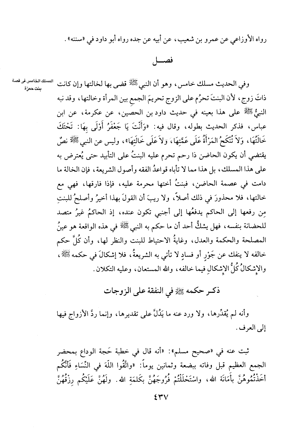 فصل وَفِي الْحَدِيثِ مَسْلَكٌ خَامِسٌ، وَهُوَ أَنَّ النَّبِيَّ صَلَّى اللَّهُ عَلَيْهِ وَسَلَّمَ قَضَى بِهَا لِخَالَتِهَا وَإِنْ كَانَتْ ذَاتَ زَوْجٍ؛ لِأَنَّ الْبِنْتَ تَحْرُمُ عَلَى الزَّوْجِ تَحْرِيمَ الْجَمْعِ بَيْنَ الْمَرْأَةِ وَخَالَتِهَا، وَقَدْ نَبَّهَ النَّبِيُّ صَلَّى اللَّهُ عَلَيْهِ وَسَلَّمَ عَلَى هَذَا بِعَيْنِهِ فِي حَدِيثِ دَاوُدَ بْنِ الْحُصَيْنِ، عَنْ عكرمة، عَنِ ابْنِ عَبَّاسٍ، فَذَكَرَ الْحَدِيثَ بِطُولِهِ وَقَالَ فِيهِ: ( «وَأَنْتَ يَا جعفر أَوْلَى بِهَا: تَحْتَكَ خَالَتُهَا، وَلَا تُنْكَحُ الْمَرْأَةُ عَلَى عَمَّتِهَا وَلَا عَلَى خَالَتِهَا» ) ، وَلَيْسَ عَنِ النَّبِيِّ صَلَّى اللَّهُ عَلَيْهِ وَسَلَّمَ نَصٌّ يَقْتَضِي أَنَّ يَكُونَ الْحَاضِنُ ذَا رَحِمٍ تَحْرُمُ عَلَيْهِ الْبِنْتُ عَلَى التَّأْبِيدِ حَتَّى يُعْتَرَضَ بِهِ عَلَى هَذَا الْمَسْلَكِ، بَلْ هَذَا مِمَّا لَا تَأْبَاهُ قَوَاعِدُ الْفِقْهِ وَأُصُولُ الشَّرِيعَةِ، فَإِنَّ الْخَالَةَ مَا دَامَتْ فِي عِصْمَةِ الْحَاضِنِ فَبِنْتُ أُخْتِهَا مُحَرَّمَةٌ عَلَيْهِ، فَإِذَا فَارَقَهَا فَهِيَ مَعَ خَالَتِهَا، فَلَا مَحْذُورَ فِي ذَلِكَ أَصْلًا، وَلَا رَيْبَ أَنَّ الْقَوْلَ بِهَذَا أَخْيَرُ وَأَصْلَحُ لِلْبِنْتِ مِنْ رَفْعِهَا إِلَى الْحَاكِمِ يَدْفَعُهَا إِلَى أَجْنَبِيٍّ تَكُونُ عِنْدَهُ؛ إِذِ الْحَاكِمُ غَيْرُ مُتَصَدٍّ لِلْحَضَانَةِ بِنَفْسِهِ، فَهَلْ يَشُكُّ أَحَدٌ أَنَّ مَا حَكَمَ بِهِ النَّبِيُّ صَلَّى اللَّهُ عَلَيْهِ وَسَلَّمَ فِي هَذِهِ الْوَاقِعَةِ هُوَ عَيْنُ الْمَصْلَحَةِ وَالْحِكْمَةِ وَالْعَدْلِ، وَغَايَةُ الِاحْتِيَاطِ لِلْبِنْتِ وَالنَّظَرِ لَهَا، وَأَنَّ كُلَّ حُكْمٍ خَالَفَهُ لَا يَنْفَكُّ عَنْ جَوْرٍ أَوْ فَسَادٍ لَا تَأْتِي بِهِ الشَّرِيعَةُ، فَلَا إِشْكَالَ فِي حُكْمِهِ صَلَّى اللَّهُ عَلَيْهِ وَسَلَّمَ، وَالْإِشْكَالُ كُلُّ الْإِشْكَالِ فِيمَا خَالَفَهُ، وَاللَّهُ الْمُسْتَعَانُ وَعَلَيْهِ التُّكْلَانُ.