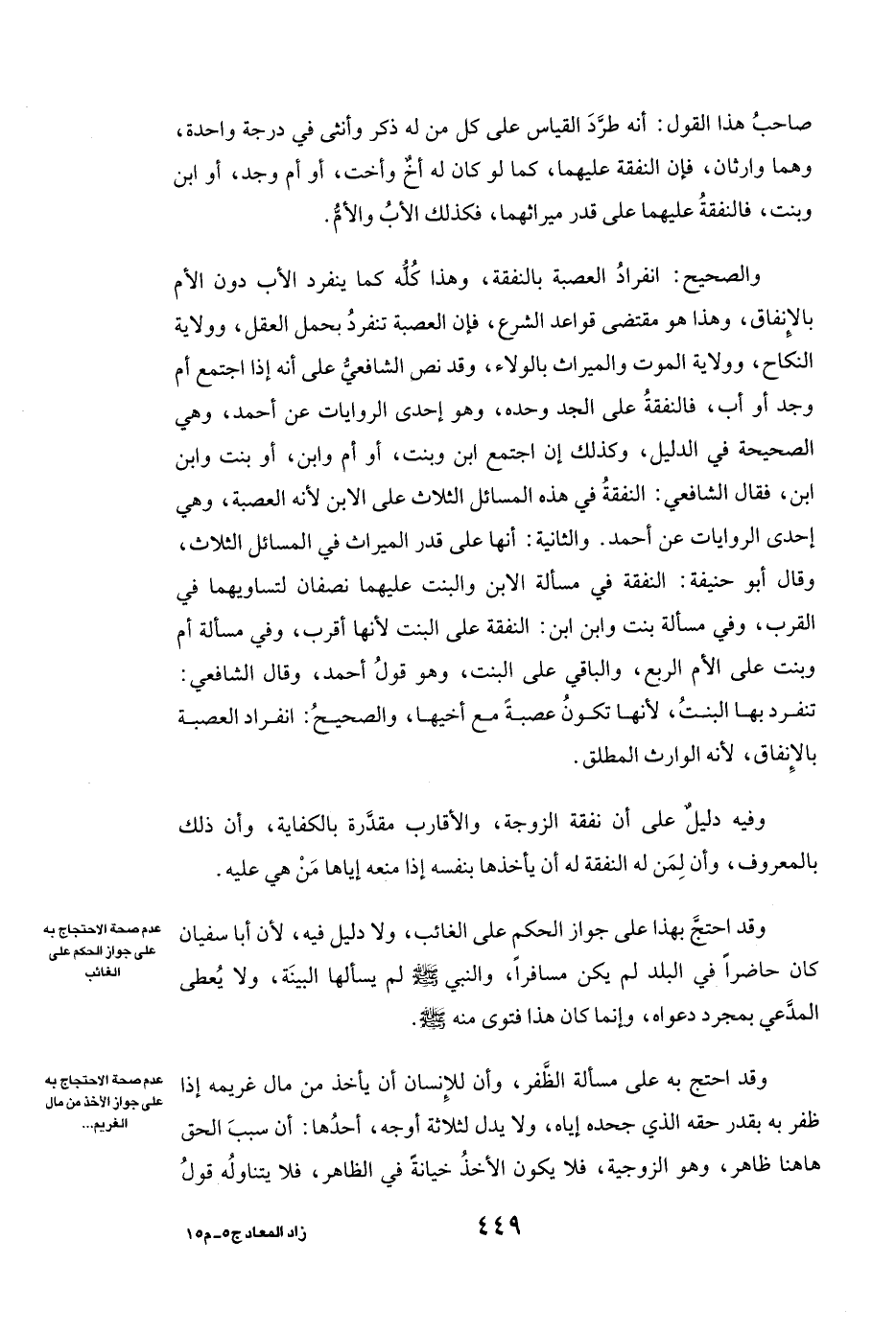 وَالصَّحِيحُ: انْفِرَادُ الْعَصَبَةِ بِالنَّفَقَةِ، وَهَذَا كُلُّهُ كَمَا يَنْفَرِدُ الْأَبُ دُونَ الْأُمِّ بِالْإِنْفَاقِ، وَهَذَا هُوَ مُقْتَضَى قَوَاعِدِ الشَّرْعِ، فَإِنَّ الْعَصَبَةَ تَنْفَرِدُ بِحَمْلِ الْعَقْلِ وَوِلَايَةِ النِّكَاحِ وَوِلَايَةِ الْمَوْتِ وَالْمِيرَاثِ بِالْوَلَاءِ، وَقَدْ نَصَّ الشَّافِعِيُّ عَلَى أَنَّهُ إِذَا اجْتَمَعَ أُمٌّ وَجَدٌّ أَوْ أَبٌ فَالنَّفَقَةُ عَلَى الْجَدِّ وَحْدَهُ، وَهُوَ إِحْدَى الرِّوَايَاتِ عَنْ أحمد وَهِيَ الصَّحِيحَةُ فِي الدَّلِيلِ، وَكَذَلِكَ إِنِ اجْتَمَعَ ابْنٌ وَبِنْتٌ، أَوْ أُمٌّ وَابْنٌ، أَوْ بِنْتٌ وَابْنُ ابْنٍ فَقَالَ الشَّافِعِيُّ: النَّفَقَةُ فِي هَذِهِ الْمَسَائِلِ الثَّلَاثِ عَلَى الِابْنِ لِأَنَّهُ الْعَصَبَةُ، وَهِيَ إِحْدَى الرِّوَايَاتِ عَنْ أحمد. وَالثَّانِيَةُ أَنَّهَا عَلَى قَدْرِ الْمِيرَاثِ فِي الْمَسَائِلِ الثَّلَاثِ، وَقَالَ أبو حنيفة: النَّفَقَةُ فِي مَسْأَلَةِ الِابْنِ وَالْبِنْتِ عَلَيْهِمَا نِصْفَانِ لِتَسَاوِيهِمَا فِي الْقُرْبِ، وَفِي مَسْأَلَةِ بِنْتٍ وَابْنِ ابْنٍ: النَّفَقَةُ عَلَى الْبِنْتِ لِأَنَّهَا أَقْرَبُ، وَفِي مَسْأَلَةِ أُمٍّ وَبِنْتٍ عَلَى الْأُمِّ الرُّبُعُ وَالْبَاقِي عَلَى الْبِنْتِ، وَهُوَ قَوْلُ أحمد، وَقَالَ الشَّافِعِيُّ: تَنْفَرِدُ بِهَا الْبِنْتُ؛ لِأَنَّهَا تَكُونُ عَصَبَةً مَعَ أَخِيهَا، وَالصَّحِيحُ: انْفِرَادُ الْعَصَبَةِ بِالْإِنْفَاقِ؛ لِأَنَّهُ الْوَارِثُ الْمُطْلَقُ.