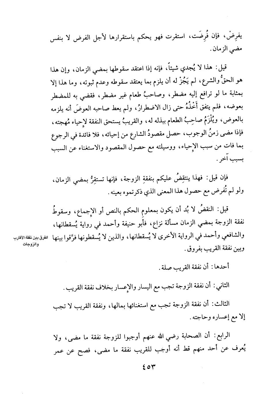 فَإِنْ قِيلَ: فَهَذَا يَنْتَقِضُ عَلَيْكُمْ بِنَفَقَةِ الزَّوْجَةِ فَإِنَّهَا تَسْتَقِرُّ بِمُضِيِّ الزَّمَانِ، وَلَوْ لَمْ تُفْرَضْ مَعَ حُصُولِ هَذَا الْمَعْنَى الَّذِي ذَكَرْتُمُوهُ بِعَيْنِهِ.