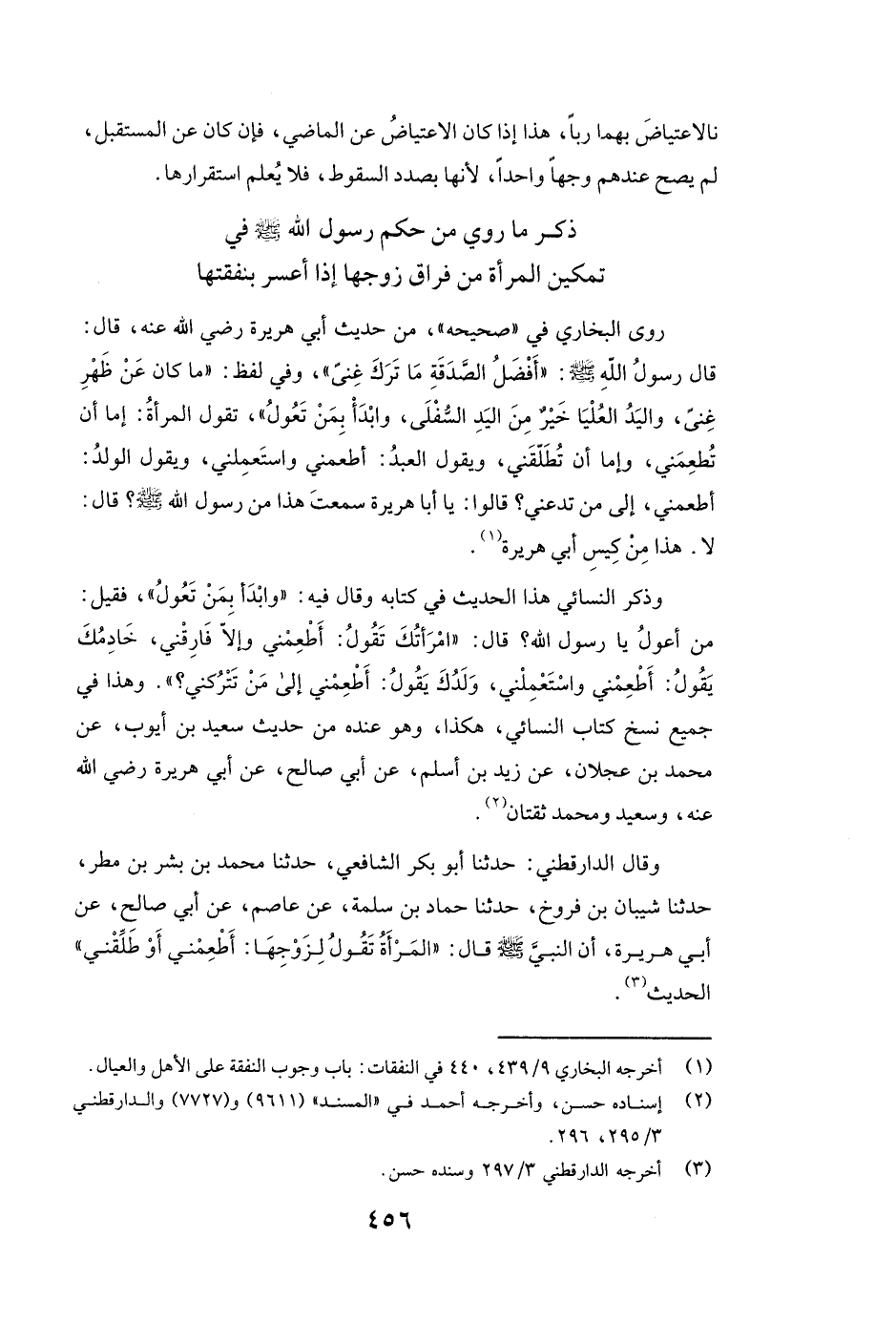 وَذَكَرَ النَّسَائِيُّ هَذَا الْحَدِيثَ فِي كِتَابِهِ وَقَالَ فِيهِ: «وَابْدَأْ بِمَنْ تَعُولُ "، فَقِيلَ: مَنْ أَعُولُ يَا رَسُولَ اللَّهِ؟ قَالَ: (امْرَأَتُكَ تَقُولُ: أَطْعِمْنِي وَإِلَّا فَارِقْنِي، خَادِمُكَ يَقُولُ: أَطْعِمْنِي وَاسْتَعْمِلْنِي، وَلَدُكَ يَقُولُ: أَطْعِمْنِي، إِلَى مَنْ تَتْرُكُنِي؟) » . وَهَذَا فِي جَمِيعِ نُسَخِ كِتَابِ النَّسَائِيِّ، هَكَذَا، وَهُوَ عِنْدَهُ مِنْ حَدِيثِ سعيد بن أيوب عَنْ مُحَمَّدِ بْنِ عَجْلَانَ عَنْ زَيْدِ بْنِ أَسْلَمَ عَنْ أبي صالح عَنْ أَبِي هُرَيْرَةَ - رَضِيَ اللَّهُ عَنْهُ -، وسعيد ومحمد ثِقَتَانِ.