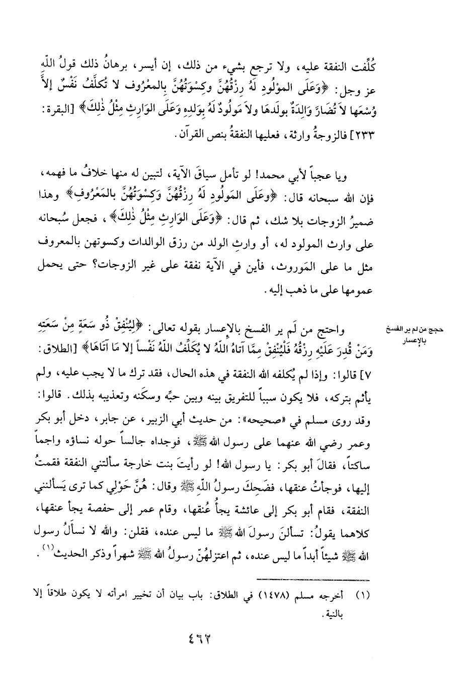 وَاحْتَجَّ مَنْ لَمْ يَرَ الْفَسْخَ بِالْإِعْسَارِ بِقَوْلِهِ تَعَالَى: {لِيُنْفِقْ ذُو سَعَةٍ مِنْ سَعَتِهِ وَمَنْ قُدِرَ عَلَيْهِ رِزْقُهُ فَلْيُنْفِقْ مِمَّا آتَاهُ اللَّهُ لَا يُكَلِّفُ اللَّهُ نَفْسًا إِلَّا مَا آتَاهَا} [الطلاق: 7] [الطَّلَاقِ: 7] قَالُوا: وَإِذَا لَمْ يُكَلِّفْهُ اللَّهُ النَّفَقَةَ فِي هَذِهِ الْحَالِ فَقَدْ تَرَكَ مَا لَا يَجِبُ عَلَيْهِ وَلَمْ يَأْثَمْ بِتَرْكِهِ، فَلَا يَكُونُ سَبَبًا لِلتَّفْرِيقِ بَيْنَهُ وَبَيْنَ حُبِّهِ وَسَكَنِهِ وَتَعْذِيبِهِ بِذَلِكَ. قَالُوا: وَقَدْ رَوَى مسلم فِي " صَحِيحِهِ " مِنْ حَدِيثِ أبي الزبير عَنْ جابر ( «دَخَلَ أبو بكر وعمر - رَضِيَ اللَّهُ عَنْهُمَا - عَلَى رَسُولِ اللَّهِ - صَلَّى اللَّهُ عَلَيْهِ وَسَلَّمَ - فَوَجَدَاهُ جَالِسًا حَوْلَهُ نِسَاؤُهُ وَاجِمًا سَاكِتًا، فَقَالَ أبو بكر: يَا رَسُولَ اللَّهِ، لَوْ رَأَيْتَ بنت خارجة سَأَلَتْنِي النَّفَقَةَ فَقُمْتُ إِلَيْهَا فَوَجَأْتُ عُنُقَهَا، فَضَحِكَ رَسُولُ اللَّهِ - صَلَّى اللَّهُ عَلَيْهِ وَسَلَّمَ - وَقَالَ: هُنَّ حَوْلِي كَمَا تَرَى يَسْأَلْنَنِي النَّفَقَةَ، فَقَامَ أبو بكر إِلَى عائشة يَجَأُ عُنُقَهَا، وَقَامَ عمر إِلَى حفصة يَجَأُ عُنُقَهَا، كِلَاهُمَا يَقُولُ: تَسْأَلْنَ رَسُولَ اللَّهِ - صَلَّى اللَّهُ عَلَيْهِ وَسَلَّمَ - مَا لَيْسَ عِنْدَهُ، فَقُلْنَ: وَاللَّهِ لَا نَسْأَلُ رَسُولَ اللَّهِ - صَلَّى اللَّهُ عَلَيْهِ وَسَلَّمَ - شَيْئًا أَبَدًا مَا لَيْسَ عِنْدَهُ، ثُمَّ اعْتَزَلَهُنَّ رَسُولُ اللَّهِ - صَلَّى اللَّهُ عَلَيْهِ وَسَلَّمَ - شَهْرًا» ) وَذَكَرَ الْحَدِيثَ.