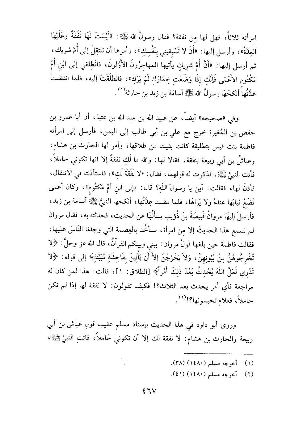 وَفِي " صَحِيحِهِ " أَيْضًا، عَنْ عُبَيْدِ اللَّهِ بْنِ عَبْدِ اللَّهِ بْنِ عُتْبَةَ، ( «أَنَّ أبا عمرو بن حفص بن المغيرة خَرَجَ مَعَ عَلِيِّ بْنِ أَبِي طَالِبٍ إِلَى الْيَمَنِ، فَأَرْسَلَ إِلَى امْرَأَتِهِ فاطمة بنت قيس بِتَطْلِيقَةٍ كَانَتْ بَقِيَتْ مِنْ طَلَاقِهَا، وَأَمَرَ لَهَا الْحَارِثُ بْنُ هِشَامٍ وعياش بن أبي ربيعة بِنَفَقَةٍ، فَقَالَا لَهَا: وَاللَّهِ مَا لَكِ نَفَقَةٌ إِلَّا أَنْ تَكُونِي حَامِلًا، فَأَتَتِ النَّبِيَّ - صَلَّى اللَّهُ عَلَيْهِ وَسَلَّمَ - فَذَكَرَتْ لَهُ قَوْلَهُمَا، فَقَالَ " لَا نَفَقَةَ لَكِ "، فَاسْتَأْذَنَتْهُ فِي الِانْتِقَالِ فَأَذِنَ لَهَا، فَقَالَتْ: أَيْنَ يَا رَسُولَ اللَّهِ؟ قَالَ " إِلَى ابْنِ أُمِّ مَكْتُومٍ " وَكَانَ أَعْمَى تَضَعُ ثِيَابَهَا عِنْدَهُ وَلَا يَرَاهَا، فَلَمَّا مَضَتْ عِدَّتُهَا أَنْكَحَهَا النَّبِيُّ - صَلَّى اللَّهُ عَلَيْهِ وَسَلَّمَ - أُسَامَةَ بْنَ زَيْدٍ، فَأَرْسَلَ إِلَيْهَا مروان قبيصة بن ذؤيب يَسْأَلُهَا عَنِ الْحَدِيثِ فَحَدَّثَتْهُ بِهِ، فَقَالَ مروان: لَمْ نَسْمَعْ هَذَا الْحَدِيثَ إِلَّا مِنِ امْرَأَةٍ، سَنَأْخُذُ بِالْعِصْمَةِ الَّتِي وَجَدْنَا النَّاسَ عَلَيْهَا، فَقَالَتْ فاطمة حِينَ بَلَغَهَا قَوْلُ مروان: بَيْنِي وَبَيْنَكُمُ الْقُرْآنُ، قَالَ اللَّهُ عَزَّ وَجَلَّ: {لَا تُخْرِجُوهُنَّ مِنْ بُيُوتِهِنَّ وَلَا يَخْرُجْنَ إِلَّا أَنْ يَأْتِينَ بِفَاحِشَةٍ مُبَيِّنَةٍ} [الطلاق: 1] إِلَى قَوْلِهِ: {لَا تَدْرِي لَعَلَّ اللَّهَ يُحْدِثُ بَعْدَ ذَلِكَ أَمْرًا} [الطلاق: 1] [الطَّلَاقِ: 1] قَالَتْ: هَذَا لِمَنْ كَانَ لَهُ مُرَاجَعَةٌ فَأَيُّ أَمْرٍ يَحْدُثُ بَعْدَ الثَّلَاثِ؟ فَكَيْفَ تَقُولُونَ: لَا نَفَقَةَ لَهَا إِذَا لَمْ تَكُنْ حَامِلًا، فَعَلَامَ تَحْبِسُونَهَا؟!» ) .