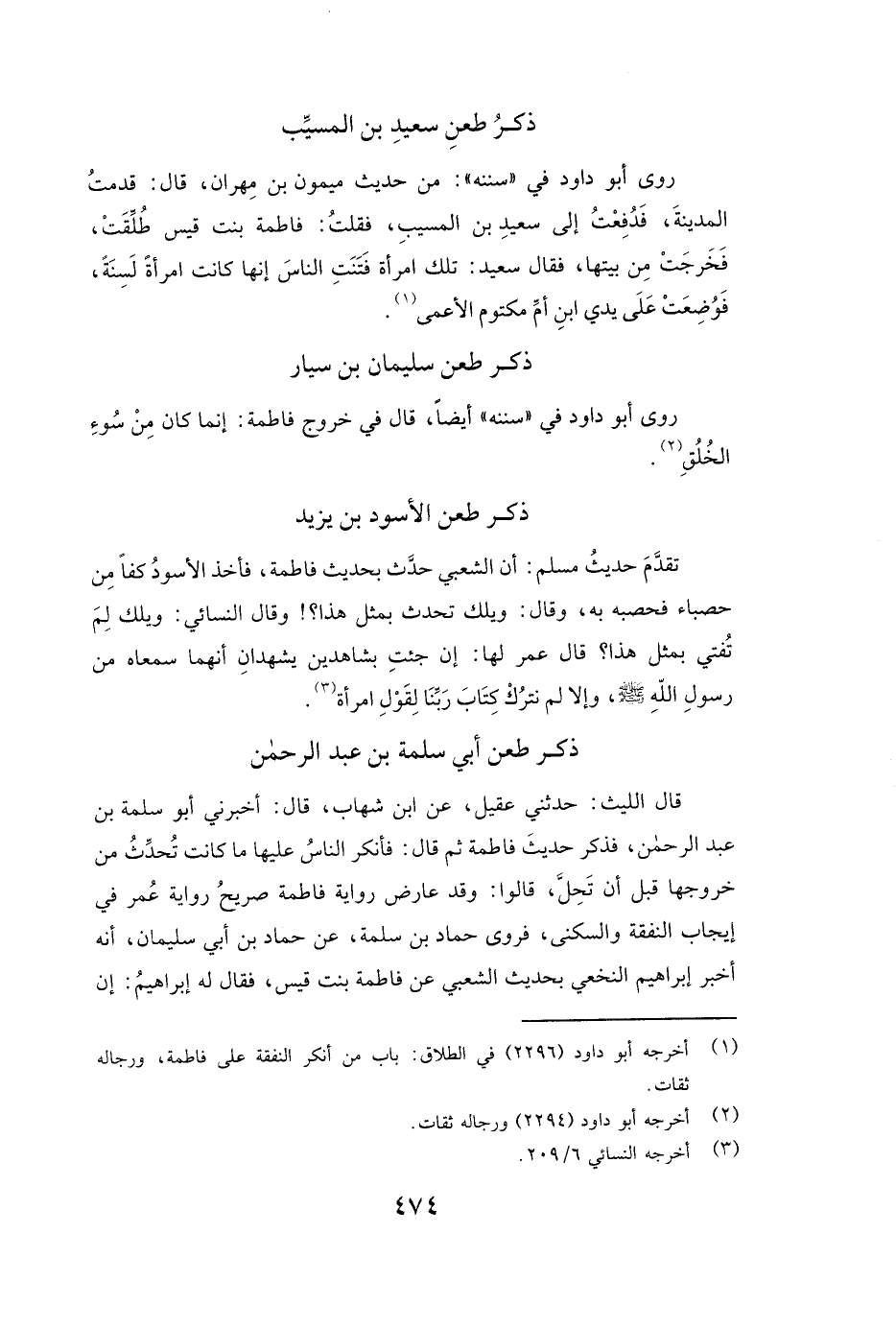 قَالَ الليث: حَدَّثَنِي عقيل عَنِ ابْنِ شِهَابٍ قَالَ: أَخْبَرَنِي أَبُو سَلَمَةَ بْنُ عَبْدِ الرَّحْمَنِ، فَذَكَرَ حَدِيثَ فاطمة ثُمَّ قَالَ: فَأَنْكَرَ النَّاسُ عَلَيْهَا مَا كَانَتْ تُحَدِّثُ مِنْ خُرُوجِهَا قَبْلَ أَنْ تَحِلَّ، قَالُوا: وَقَدْ عَارَضَ رِوَايَةَ فاطمة صَرِيحُ رِوَايَةِ عمر فِي إِيجَابِ النَّفَقَةِ وَالسُّكْنَى، فَرَوَى حَمَّادُ بْنُ سَلَمَةَ عَنْ حَمَّادِ بْنِ أَبِي سُلَيْمَانَ أَنَّهُ أَخْبَرَ إِبْرَاهِيمَ النَّخَعِيَّ بِحَدِيثِ الشَّعْبِيِّ عَنْ فاطمة بنت قيس، فَقَالَ لَهُ إبراهيم: إِنَّ