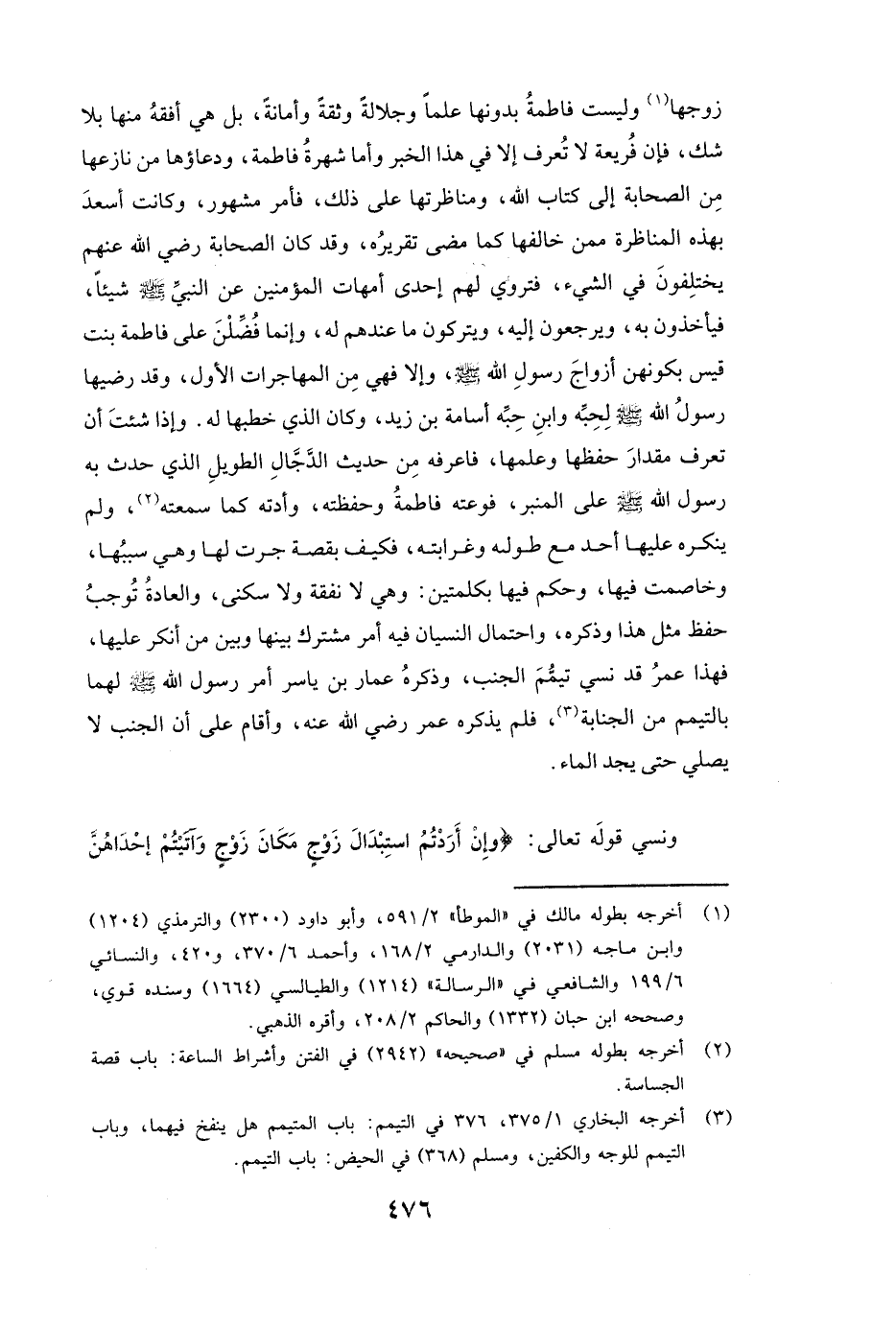 زَوْجِهَا، وَلَيْسَتْ فاطمة بِدُونِهَا عِلْمًا وَجَلَالَةً وَثِقَةً وَأَمَانَةً، بَلْ هِيَ أَفْقَهُ مِنْهَا بِلَا شَكٍّ، فَإِنَّ فريعة لَا تُعْرَفُ إِلَّا فِي هَذَا الْخَبَرِ، وَأَمَّا شُهْرَةُ فاطمة وَدُعَاؤُهَا مَنْ نَازَعَهَا مِنَ الصَّحَابَةِ إِلَى كِتَابِ اللَّهِ وَمُنَاظَرَتُهَا عَلَى ذَلِكَ فَأَمْرٌ مَشْهُورٌ، وَكَانَتْ أَسْعَدَ بِهَذِهِ الْمُنَاظَرَةِ مِمَّنْ خَالَفَهَا كَمَا مَضَى تَقْرِيرُهُ، وَقَدْ كَانَ الصَّحَابَةُ - رَضِيَ اللَّهُ عَنْهُمْ - يَخْتَلِفُونَ فِي الشَّيْءِ فَتَرْوِي لَهُمْ إِحْدَى أُمَّهَاتِ الْمُؤْمِنِينَ عَنِ النَّبِيِّ - صَلَّى اللَّهُ عَلَيْهِ وَسَلَّمَ - شَيْئًا، فَيَأْخُذُونَ بِهِ وَيَرْجِعُونَ إِلَيْهِ وَيَتْرُكُونَ مَا عِنْدَهُمْ لَهُ، وَإِنَّمَا فُضِّلْنَ عَلَى فاطمة بنت قيس بِكَوْنِهِنَّ أَزْوَاجَ رَسُولِ اللَّهِ - صَلَّى اللَّهُ عَلَيْهِ وَسَلَّمَ - وَإِلَّا فَهِيَ مِنَ الْمُهَاجِرَاتِ الْأُوَلِ وَقَدْ رَضِيَهَا رَسُولُ اللَّهِ - صَلَّى اللَّهُ عَلَيْهِ وَسَلَّمَ - لِحِبِّهِ وَابْنِ حِبِّهِ أُسَامَةَ بْنِ زَيْدٍ، وَكَانَ الَّذِي خَطَبَهَا لَهُ. وَإِذَا شِئْتَ أَنْ تَعْرِفَ مِقْدَارَ حِفْظِهَا وَعِلْمِهَا فَاعْرِفْهُ مِنْ حَدِيثِ الدَّجَّالِ الطَّوِيلِ الَّذِي حَدَّثَ بِهِ رَسُولُ اللَّهِ - صَلَّى اللَّهُ عَلَيْهِ وَسَلَّمَ - عَلَى الْمِنْبَرِ فَوَعَتْهُ فاطمة وَحَفِظَتْهُ، وَأَدَّتْهُ كَمَا سَمِعَتْهُ وَلَمْ يُنْكِرْهُ عَلَيْهَا أَحَدٌ مَعَ طُولِهِ وَغَرَابَتِهِ، فَكَيْفَ بِقِصَّةٍ جَرَتْ لَهَا وَهِيَ سَبَبُهَا وَخَاصَمَتْ فِيهَا وَحُكِمَ فِيهَا بِكَلِمَتَيْنِ وَهِيَ: لَا نَفَقَةَ وَلَا سُكْنَى، وَالْعَادَةُ تُوجِبُ حِفْظَ مِثْلِ هَذَا وَذِكْرَهُ، وَاحْتِمَالُ النِّسْيَانِ فِيهِ أَمْرٌ مُشْتَرَكٌ بَيْنَهَا وَبَيْنَ مَنْ أَنْكَرَ عَلَيْهَا، فَهَذَا عمر قَدْ نَسِيَ تَيَمُّمَ الْجُنُبِ، وَذَكَّرَهُ عَمَّارُ بْنُ يَاسِرٍ أَمْرَ رَسُولِ اللَّهِ - صَلَّى اللَّهُ عَلَيْهِ وَسَلَّمَ - لَهُمَا بِالتَّيَمُّمِ مِنَ الْجَنَابَةِ فَلَمْ يَذْكُرْهُ عمر - رَضِيَ اللَّهُ عَنْهُ - وَأَقَامَ عَلَى أَنَّ الْجُنُبَ لَا يُصَلِّي حَتَّى يَجِدَ الْمَاءَ.