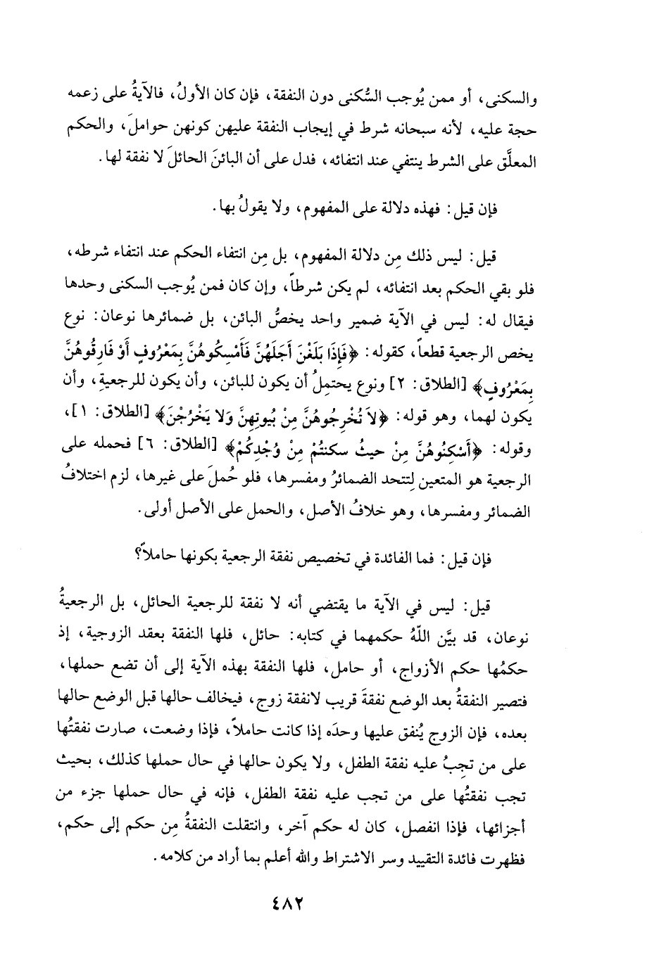 قِيلَ: لَيْسَ فِي الْآيَةِ مَا يَقْتَضِي أَنَّهُ لَا نَفَقَةَ لِلرَّجْعِيَّةِ الْحَائِلِ، بَلِ الرَّجْعِيَّةُ نَوْعَانِ قَدْ بَيَّنَ اللَّهُ حُكْمَهُمَا فِي كِتَابِهِ: حَائِلٌ: فَلَهَا النَّفَقَةُ بِعَقْدِ الزَّوْجِيَّةِ إِذْ حُكْمُهَا حُكْمُ الْأَزْوَاجِ، أَوْ حَامِلٌ: فَلَهَا النَّفَقَةُ بِهَذِهِ الْآيَةِ إِلَى أَنْ تَضَعَ حَمْلَهَا، فَتَصِيرُ النَّفَقَةُ بَعْدَ الْوَضْعِ نَفَقَةَ قَرِيبٍ لَا نَفَقَةَ زَوْجٍ، فَيُخَالِفُ حَالُهَا قَبْلَ الْوَضْعِ حَالَهَا بَعْدَهُ، فَإِنَّ الزَّوْجَ يُنْفِقُ عَلَيْهَا وَحْدَهُ إِذَا كَانَتْ حَامِلًا، فَإِذَا وَضَعَتْ صَارَتْ نَفَقَتُهَا عَلَى مَنْ تَجِبُ عَلَيْهِ نَفَقَةُ الطِّفْلِ، وَلَا يَكُونُ حَالُهَا فِي حَالِ حَمْلِهَا كَذَلِكَ، بِحَيْثُ تَجِبُ نَفَقَتُهَا عَلَى مَنْ تَجِبُ عَلَيْهِ نَفَقَةُ الطِّفْلِ، فَإِنَّهُ فِي حَالِ حَمْلِهَا جُزْءٌ مِنْ أَجْزَائِهَا، فَإِذَا انْفَصَلَ كَانَ لَهُ حُكْمٌ آخَرُ، وَانْتَقَلَتِ النَّفَقَةُ مِنْ حُكْمٍ إِلَى حُكْمٍ، فَظَهَرَتْ فَائِدَةُ التَّقْيِيدِ وَسِرُّ الِاشْتِرَاطِ، وَاللَّهُ أَعْلَمُ بِمَا أَرَادَ مِنْ كَلَامِهِ.