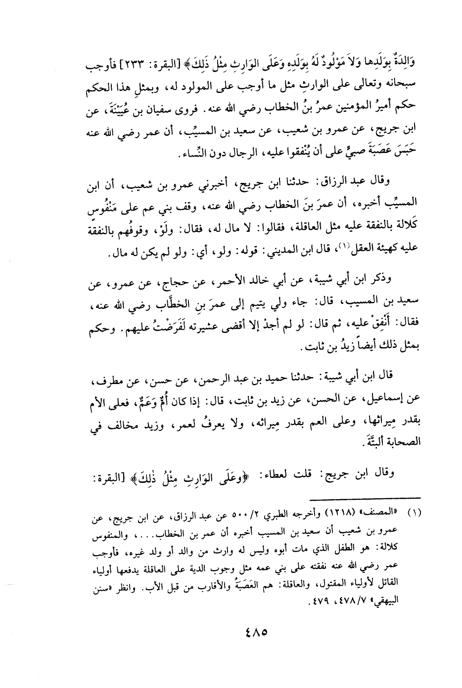 [الْبَقَرَةِ: 233] فَأَوْجَبَ سُبْحَانَهُ وَتَعَالَى عَلَى الْوَارِثِ مِثْلَ مَا أَوْجَبَ عَلَى الْمَوْلُودِ لَهُ، وَبِمِثْلِ هَذَا الْحُكْمِ حَكَمَ أَمِيرُ الْمُؤْمِنِينَ عُمَرُ بْنُ الْخَطَّابِ - رَضِيَ اللَّهُ عَنْهُ -. فَرَوَى سُفْيَانُ بْنُ عُيَيْنَةَ عَنِ ابْنِ جُرَيْجٍ عَنْ عَمْرِو بْنِ شُعَيْبٍ عَنْ سَعِيدِ بْنِ الْمُسَيَّبِ أَنَّ عمر - رَضِيَ اللَّهُ عَنْهُ - حَبَسَ عَصَبَةَ صَبِيٍّ عَلَى أَنْ يُنْفِقُوا عَلَيْهِ، الرِّجَالَ دُونَ النِّسَاءِ.