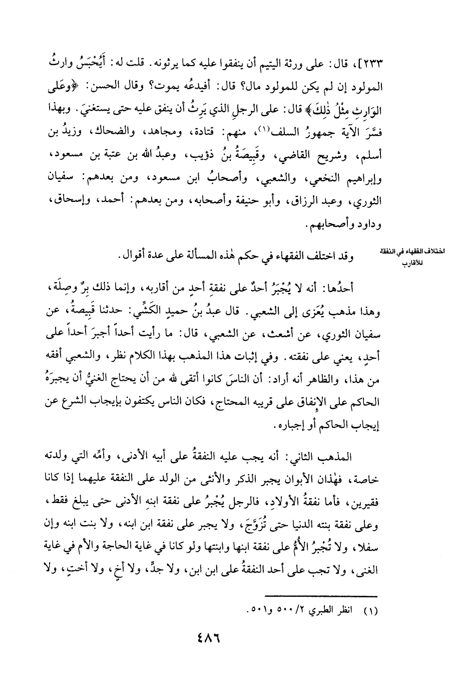 233 -] قَالَ: عَلَى وَرَثَةِ الْيَتِيمِ أَنْ يُنْفِقُوا عَلَيْهِ كَمَا يَرِثُونَهُ. قُلْتُ لَهُ: أَيُحْبَسُ وَارِثُ الْمَوْلُودِ إِنْ لَمْ يَكُنْ لِلْمَوْلُودِ مَالٌ؟ قَالَ: أَفَيَدَعُهُ يَمُوتُ؟ وَقَالَ الْحَسَنُ: {وَعَلَى الْوَارِثِ مِثْلُ ذَلِكَ} [البقرة: 233] قَالَ: عَلَى الرَّجُلِ الَّذِي يَرِثُ أَنْ يُنْفِقَ عَلَيْهِ حَتَّى يَسْتَغْنِيَ. وَبِهَذَا فَسَّرَ الْآيَةَ جُمْهُورُ السَّلَفِ مِنْهُمْ قتادة ومجاهد والضحاك وَزَيْدُ بْنُ أَسْلَمَ وَشُرَيْحٌ الْقَاضِي وَقَبِيصَةُ بْنُ ذُؤَيْبٍ وَعَبْدُ اللَّهِ بْنُ عُتْبَةَ بْنِ مَسْعُودٍ وَإِبْرَاهِيمُ النَّخَعِيُّ وَالشَّعْبِيُّ وَأَصْحَابُ ابْنِ مَسْعُودٍ، وَمِنْ بَعْدِهِمْ: سُفْيَانُ الثَّوْرِيُّ وعبد الرزاق وأبو حنيفة وَأَصْحَابُهُ، وَمِنْ بَعْدِهِمْ: أحمد وإسحاق وداود وَأَصْحَابُهُمْ.