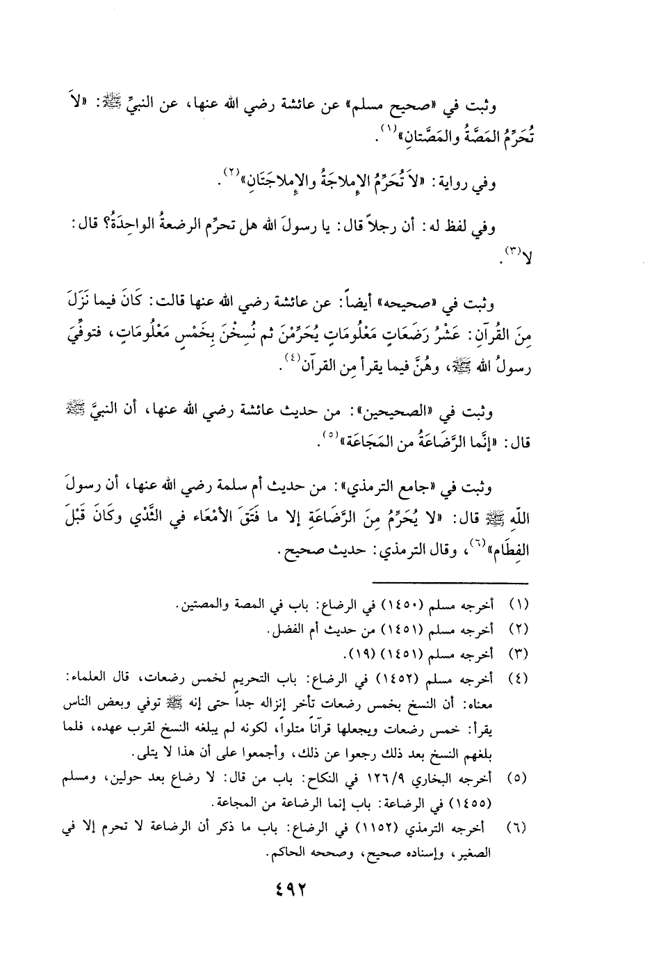 وَثَبَتَ فِي " صَحِيحِهِ " أَيْضًا: عَنْ عائشة - رَضِيَ اللَّهُ عَنْهَا - قَالَتْ: ( «كَانَ فِيمَا نَزَلَ مِنَ الْقُرْآنِ: عَشْرُ رَضَعَاتٍ مَعْلُومَاتٍ يُحَرِّمْنَ ثُمَّ نُسِخْنَ بِخَمْسٍ مَعْلُومَاتٍ، فَتُوُفِّيَ رَسُولُ اللَّهِ - صَلَّى اللَّهُ عَلَيْهِ وَسَلَّمَ - وَهُنَّ فِيمَا يُقْرَأُ مِنَ الْقُرْآنِ» ) .