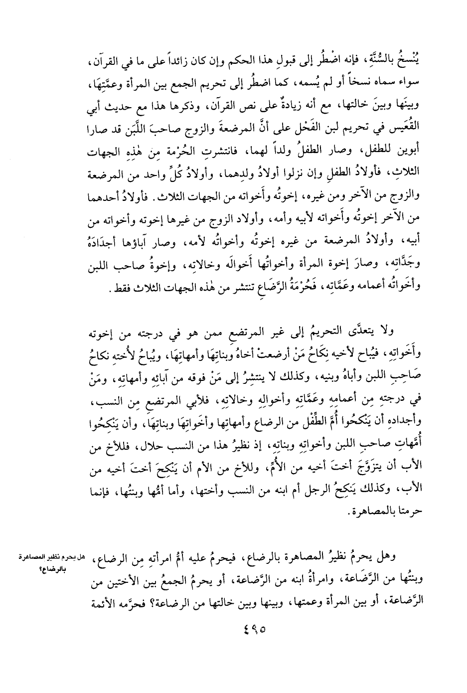 يُنْسَخُ بِالسُّنَّةِ، فَإِنَّهُ اضْطُرَّ إِلَى قَبُولِ هَذَا الْحُكْمِ وَإِنْ كَانَ زَائِدًا عَلَى مَا فِي الْقُرْآنِ، سَوَاءٌ سَمَّاهُ نَسْخًا أَوْ لَمْ يُسَمِّهِ، كَمَا اضْطُرَّ إِلَى تَحْرِيمِ الْجَمْعِ بَيْنَ الْمَرْأَةِ وَعَمَّتِهَا وَبَيْنَهَا وَبَيْنَ خَالَتِهَا مَعَ أَنَّهُ زِيَادَةٌ عَلَى نَصِّ الْقُرْآنِ، وَذَكَرَهَا هَذَا مَعَ حَدِيثِ أبي القعيس فِي تَحْرِيمِ لَبَنِ الْفَحْلِ عَلَى أَنَّ الْمُرْضِعَةَ وَالزَّوْجَ صَاحِبَ اللَّبَنِ قَدْ صَارَا أَبَوَيْنِ لِلطِّفْلِ، وَصَارَ الطِّفْلُ وَلَدًا لَهُمَا، فَانْتَشَرَتِ الْحُرْمَةُ مِنْ هَذِهِ الْجِهَاتِ الثَّلَاثِ، فَأَوْلَادُ الطِّفْلِ وَإِنْ نَزَلُوا أَوْلَادُ وَلَدِهِمَا، وَأَوْلَادُ كُلِّ وَاحِدٍ مِنَ الْمُرْضِعَةِ وَالزَّوْجِ مِنَ الْآخَرِ وَمِنْ غَيْرِهِ إِخْوَتُهُ وَأَخَوَاتُهُ مِنَ الْجِهَاتِ الثَّلَاثِ، فَأَوْلَادُ أَحَدِهِمَا مِنَ الْآخَرِ إِخْوَتُهُ وَأَخَوَاتُهُ لِأَبِيهِ وَأُمِّهِ، وَأَوْلَادُ الزَّوْجِ مِنْ غَيْرِهَا إِخْوَتُهُ وَأَخَوَاتُهُ مِنْ أَبِيهِ، وَأَوْلَادُ الْمُرْضِعَةِ مَنْ غَيْرِهِ إِخْوَتُهُ وَأَخَوَاتُهُ لِأُمِّهِ، وَصَارَ آبَاؤُهَا أَجْدَادَهُ وَجَدَّاتِهِ، وَصَارَ إِخْوَةُ الْمَرْأَةِ وَأَخَوَاتِهَا أَخْوَالَهُ وَخَالَاتِهِ، وَإِخْوَةُ صَاحِبِ اللَّبَنِ وَأَخَوَاتُهُ أَعْمَامَهُ وَعَمَّاتِهِ، فَحُرْمَةُ الرَّضَاعِ تَنْتَشِرُ مِنْ هَذِهِ الْجِهَاتِ الثَّلَاثِ فَقَطْ.