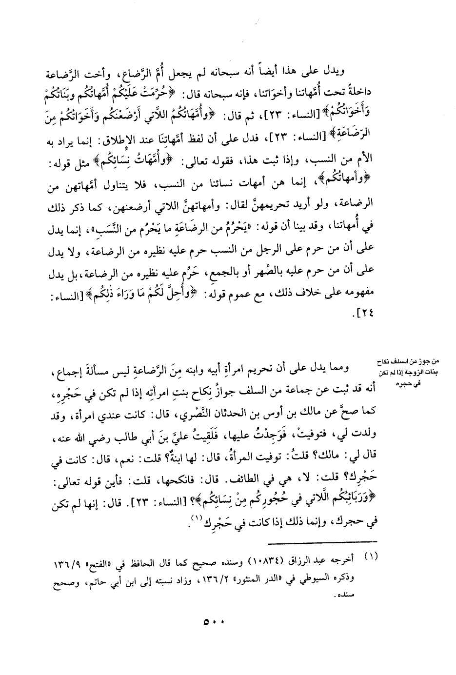 وَمِمَّا يَدُلُّ عَلَى أَنَّ تَحْرِيمَ امْرَأَةِ أَبِيهِ وَابْنِهِ مِنَ الرَّضَاعَةِ لَيْسَ مَسْأَلَةَ إِجْمَاعٍ، أَنَّهُ قَدْ ثَبَتَ عَنْ جَمَاعَةٍ مِنَ السَّلَفِ جَوَازُ نِكَاحِ بِنْتِ امْرَأَتِهِ إِذَا لَمْ تَكُنْ فِي حَجْرِهِ، كَمَا صَحَّ عَنْ مَالِكِ بْنِ أَوْسِ بْنِ الْحَدَثَانِ النَّصْرِيِّ قَالَ: كَانَتْ عِنْدِي امْرَأَةٌ وَقَدْ وَلَدَتْ لِي فَتُوُفِّيَتْ فَوَجِدْتُ عَلَيْهَا، فَلَقِيتُ عَلِيَّ بْنَ أَبِي طَالِبٍ - رَضِيَ اللَّهُ عَنْهُ - قَالَ لِي: مَا لَكَ؟ قُلْتُ: تُوُفِّيَتِ الْمَرْأَةُ، قَالَ: لَهَا ابْنَةٌ؟ قُلْتُ: نَعَمْ، قَالَ: كَانَتْ فِي حَجْرِكَ؟ قُلْتُ: لَا، هِيَ فِي الطَّائِفِ. قَالَ: فَانْكِحْهَا، قُلْتُ: فَأَيْنَ قَوْلُهُ تَعَالَى: {وَرَبَائِبُكُمُ اللَّاتِي فِي حُجُورِكُمْ مِنْ نِسَائِكُمُ} [النساء: 23] ؟ [النِّسَاءِ: 23] . قَالَ: إِنَّهَا لَمْ تَكُنْ فِي حَجْرِكَ، وَإِنَّمَا ذَلِكَ إِذَا كَانَتْ فِي حَجْرِكَ.