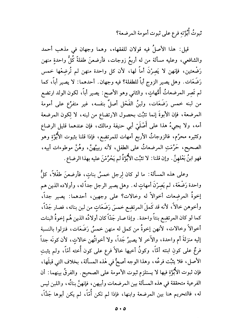 وَعَلَى هَذِهِ الْمَسْأَلَةِ: مَا لَوْ كَانَ لِرَجُلٍ خَمْسُ بَنَاتٍ فَأَرْضَعْنَ طِفْلًا كُلُّ وَاحِدَةٍ رَضْعَةً لَمْ يَصِرْنَ أُمَّهَاتٍ لَهُ. وَهَلْ يَصِيرُ الرَّجُلُ جَدًّا لَهُ، وَأَوْلَادُهُ الَّذِينَ هُمْ إِخْوَةُ الْمُرْضِعَاتِ أَخْوَالًا لَهُ وَخَالَاتٍ؟ عَلَى وَجْهَيْنِ أَحَدُهُمَا: يَصِيرُ جَدًّا وَأَخُوهُنَّ خَالًا؛ لِأَنَّهُ قَدْ كَمَلَ الْمُرْتَضِعُ خَمْسَ رَضَعَاتٍ مِنْ لَبَنِ بَنَاتِهِ فَصَارَ جَدًّا، كَمَا لَوْ كَانَ الْمُرْتَضِعُ بِنْتًا وَاحِدَةً. وَإِذَا صَارَ جَدًّا كَانَ أَوْلَادُهُ الَّذِينَ هُمْ إِخْوَةُ الْبَنَاتِ أَخْوَالًا وَخَالَاتٍ، لِأَنَّهُنَّ إِخْوَةُ مَنْ كَمَلَ لَهُ مِنْهُنَّ خَمْسُ رَضَعَاتٍ فَنُزِّلُوا بِالنِّسْبَةِ إِلَيْهِ مَنْزِلَةَ أُمٍّ وَاحِدَةٍ، وَالْآخَرُ: لَا يَصِيرُ جَدًّا وَلَا أَخَوَاتُهُنَّ خَالَاتٍ؛ لِأَنَّ كَوْنَهُ جَدًّا فَرْعٌ عَلَى كَوْنِ ابْنَتِهِ أُمًّا، وَكَوْنُ أَخِيهَا خَالًا فَرْعٌ عَلَى كَوْنِ أُخْتِهِ أُمًّا، وَلَمْ يَثْبُتِ الْأَصْلُ فَلَا يَثْبُتُ فَرْعُهُ، وَهَذَا الْوَجْهُ أَصَحُّ فِي هَذِهِ الْمَسْأَلَةِ بِخِلَافِ الَّتِي قَبْلَهَا؛ فَإِنَّ ثُبُوتَ الْأُبُوَّةِ فِيهَا لَا يَسْتَلْزِمُ ثُبُوتَ الْأُمُومَةِ عَلَى الصَّحِيحِ. وَالْفَرْقُ بَيْنَهُمَا: أَنَّ الْفَرْعِيَّةَ مُتَحَقِّقَةٌ فِي هَذِهِ الْمَسْأَلَةِ بَيْنَ الْمُرْضِعَاتِ وَأَبِيهِنَّ فَإِنَّهُنَّ بَنَاتُهُ، وَاللَّبَنُ لَيْسَ لَهُ، فَالتَّحْرِيمُ هُنَا بَيْنَ الْمُرْضِعَةِ وَابْنِهَا، فَإِذَا لَمْ تَكُنْ أُمًّا لَمْ يَكُنْ أَبُوهَا جَدًّا،