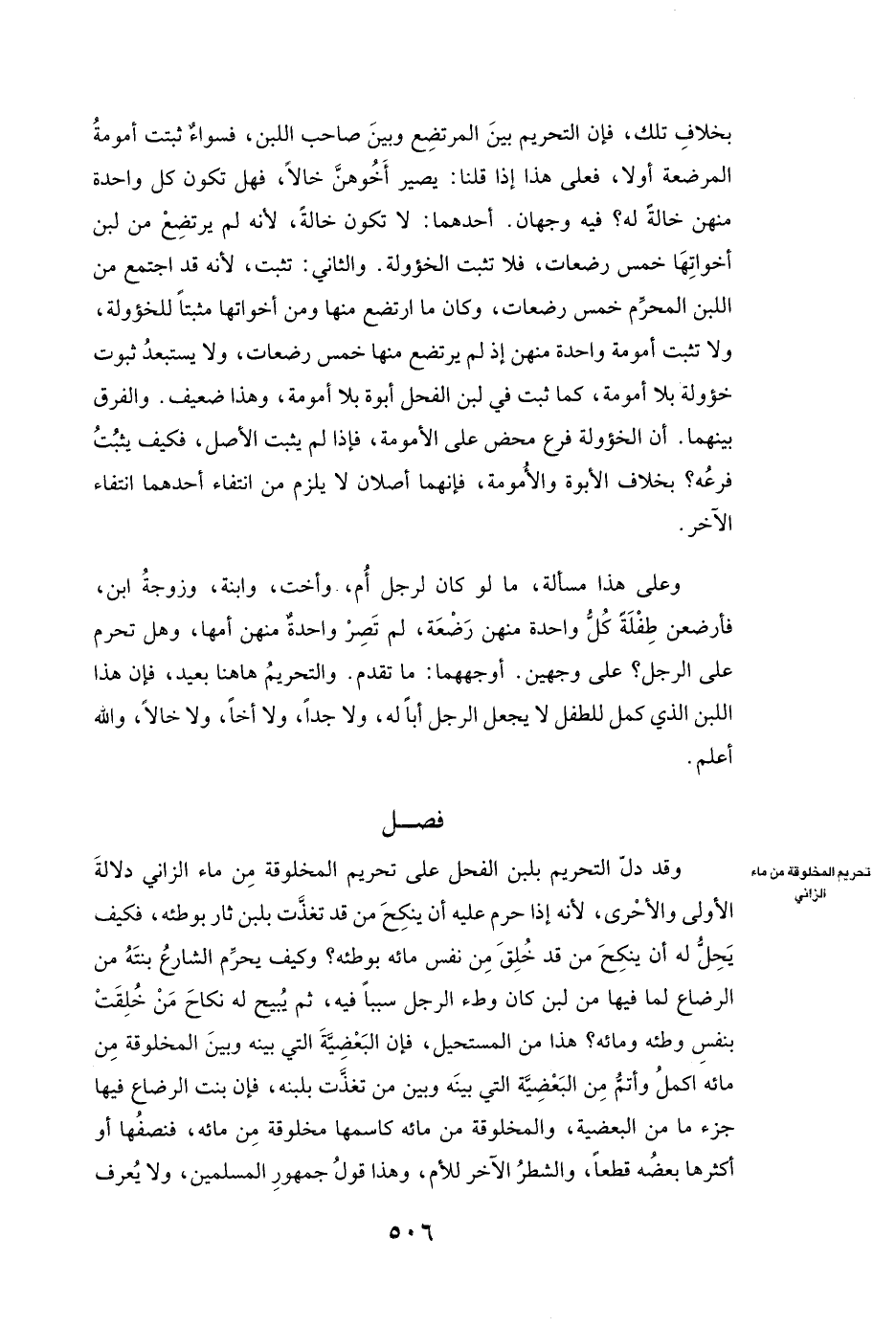 فَصْلٌ وَقَدْ دَلَّ التَّحْرِيمُ بِلَبَنِ الْفَحْلِ عَلَى تَحْرِيمِ الْمَخْلُوقَةِ مِنْ مَاءِ الزَّانِي دَلَالَةَ الْأَوْلَى وَالْأَحْرَى؛ لِأَنَّهُ إِذَا حَرُمَ عَلَيْهِ أَنْ يَنْكِحَ مَنْ قَدْ تَغَذَّتْ بِلَبَنٍ ثَارَ بِوَطْئِهِ، فَكَيْفَ يَحِلُّ لَهُ أَنْ يَنْكِحَ مَنْ قَدْ خُلِقَ مِنْ نَفْسِ مَائِهِ بِوَطْئِهِ؟ وَكَيْفَ يُحَرِّمُ الشَّارِعُ بِنْتَهُ مِنَ الرَّضَاعِ لِمَا فِيهَا مِنْ لَبَنٍ كَانَ وَطْءُ الرَّجُلِ سَبَبًا فِيهِ، ثُمَّ يُبِيحُ لَهُ نِكَاحَ مَنْ خُلِقَتْ بِنَفْسِ وَطْئِهِ وَمَائِهِ؟ هَذَا مِنَ الْمُسْتَحِيلِ؛ فَإِنَّ الْبَعْضِيَّةَ الَّتِي بَيْنَهُ وَبَيْنَ الْمَخْلُوقَةِ مِنْ مَائِهِ أَكْمَلُ وَأَتَمُّ مِنَ الْبَعْضِيَّةِ الَّتِي بَيْنَهُ وَبَيْنَ مَنْ تَغَذَّتْ بِلَبَنِهِ، فَإِنَّ بِنْتَ الرَّضَاعِ فِيهَا جُزْءٌ مَا مِنَ الْبَعْضِيَّةِ، وَالْمَخْلُوقَةُ مِنْ مَائِهِ كَاسْمِهَا مَخْلُوقَةٌ مِنْ مَائِهِ، فَنِصْفُهَا أَوْ أَكْثَرُهَا بَعْضُهُ قَطْعًا، وَالشَّطْرُ الْآخَرُ لِلْأُمِّ، وَهَذَا قَوْلُ جُمْهُورِ الْمُسْلِمِينَ، وَلَا يُعْرَفُ