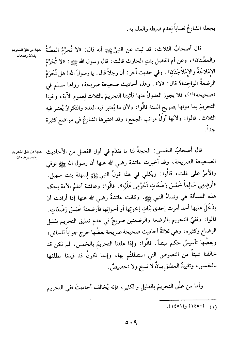 قَالَ أَصْحَابُ الْخَمْسِ: الْحُجَّةُ لَنَا مَا تَقَدَّمَ فِي أَوَّلِ الْفَصْلِ مِنَ الْأَحَادِيثِ الصَّحِيحَةِ الصَّرِيحَةِ، وَقَدْ أَخْبَرَتْ عائشة رَضِيَ اللَّهُ عَنْهَا أَنَّ رَسُولَ اللَّهِ صَلَّى اللَّهُ عَلَيْهِ وَسَلَّمَ تُوُفِّيَ وَالْأَمْرُ عَلَى ذَلِكَ، قَالُوا: وَيَكْفِي فِي هَذَا قَوْلُ النَّبِيِّ صَلَّى اللَّهُ عَلَيْهِ وَسَلَّمَ لسهلة بنت سهيل: «أَرْضِعِي سالما خَمْسَ رَضَعَاتٍ تَحْرُمِي عَلَيْهِ» . قَالُوا: وعائشة أَعْلَمُ الْأُمَّةِ بِحُكْمِ هَذِهِ الْمَسْأَلَةِ هِيَ وَنِسَاءُ النَّبِيِّ صَلَّى اللَّهُ عَلَيْهِ وَسَلَّمَ، وَكَانَتْ عائشة رَضِيَ اللَّهُ عَنْهَا إِذَا أَرَادَتْ أَنْ يَدْخُلَ عَلَيْهَا أَحَدٌ أَمَرَتْ إِحْدَى بَنَاتِ إِخْوَتِهَا أَوْ أَخَوَاتِهَا فَأَرْضَعَتْهُ خَمْسَ رَضَعَاتٍ. قَالُوا: وَنَفْيُ التَّحْرِيمِ بِالرَّضْعَةِ وَالرَّضْعَتَيْنِ صَرِيحٌ فِي عَدَمِ تَعْلِيقِ التَّحْرِيمِ بِقَلِيلِ الرَّضَاعِ وَكَثِيرِهِ، وَهِيَ ثَلَاثَةُ أَحَادِيثَ صَحِيحَةٌ صَرِيحَةٌ بَعْضُهَا خَرَجَ جَوَابًا لِلسَّائِلِ، وَبَعْضُهَا تَأْسِيسُ حُكْمٍ مُبْتَدَأٍ. قَالُوا: وَإِذَا عَلَّقْنَا التَّحْرِيمَ بِالْخَمْسِ، لَمْ نَكُنْ قَدْ خَالَفْنَا شَيْئًا مِنَ النَّصُوصِ الَّتِي اسْتَدْلَلْتُمْ بِهَا، وَإِنَّمَا نَكُونُ قَدْ قَيَّدْنَا مُطْلَقَهَا بِالْخَمْسِ، وَتَقْيِيدُ الْمُطْلَقِ بَيَانٌ لَا نَسْخٌ وَلَا تَخْصِيصٌ.