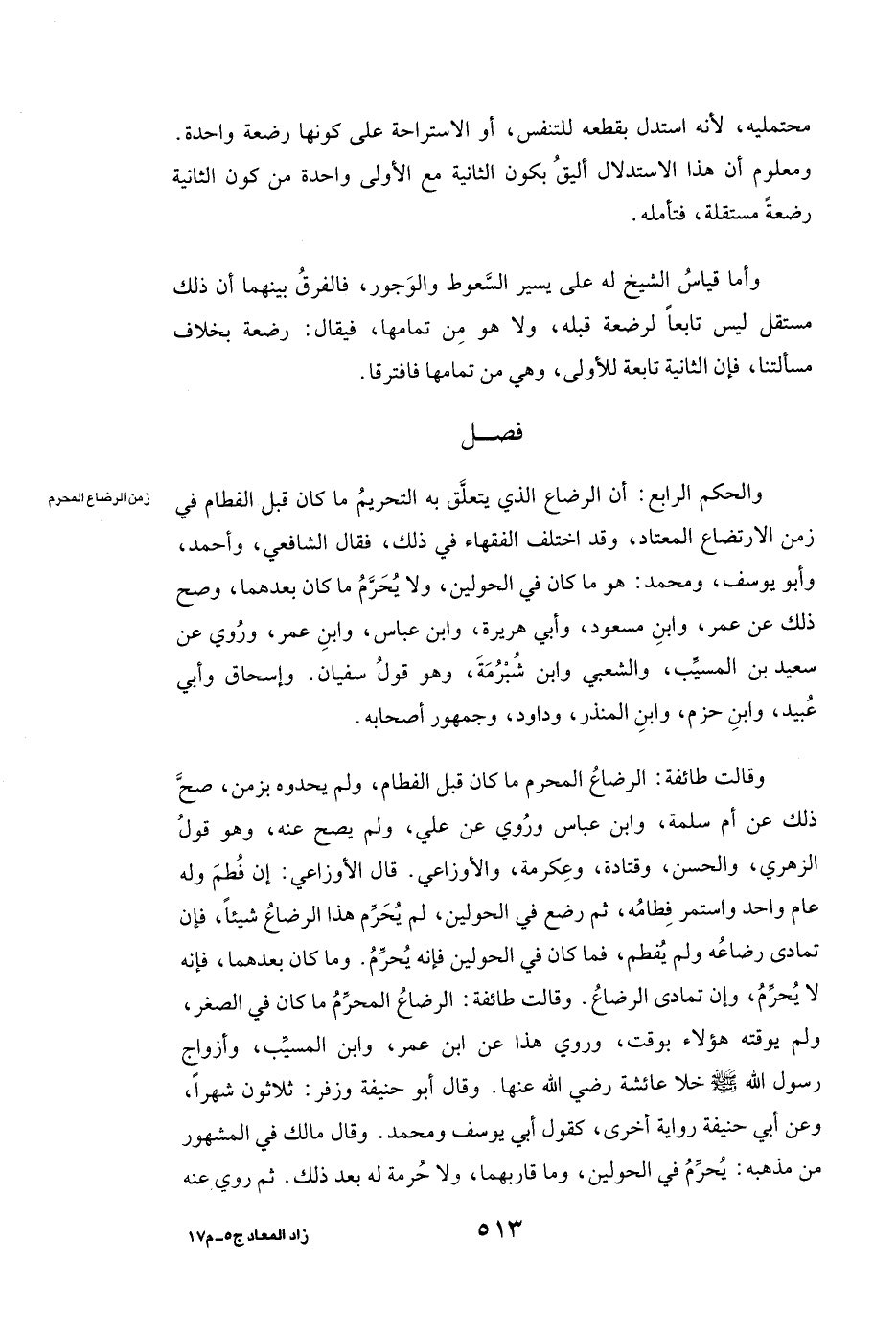 فَصْلٌ وَالْحُكْمُ الرَّابِعُ: أَنَّ الرَّضَاعَ الَّذِي يَتَعَلَّقُ بِهِ التَّحْرِيمُ مَا كَانَ قَبْلَ الْفِطَامِ فِي زَمَنِ الِارْتِضَاعِ الْمُعْتَادِ، وَقَدِ اخْتَلَفَ الْفُقَهَاءُ فِي ذَلِكَ، فَقَالَ الشَّافِعِيُّ، وأحمد، وأبو يوسف، ومحمد: هُوَ مَا كَانَ فِي الْحَوْلَيْنِ، وَلَا يُحَرِّمُ مَا كَانَ بَعْدَهُمَا، وَصَحَّ ذَلِكَ عَنْ عمر، وَابْنِ مَسْعُودٍ، وَأَبِي هُرَيْرَةَ، وَابْنِ عَبَّاسٍ، وَابْنِ عُمَرَ، وَرُوِيَ عَنْ سَعِيدِ بْنِ الْمُسَيَّبِ، وَالشَّعْبِيِّ، وَابْنِ شُبْرُمَةَ، وَهُوَ قَوْلُ سفيان، وإسحاق، وأبي عبيد، وَابْنِ حَزْمٍ، وابن المنذر، وداود، وَجُمْهُورِ أَصْحَابِهِ.