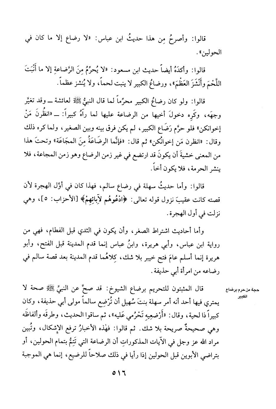 قَالُوا: وَلَوْ كَانَ رَضَاعُ الْكَبِيرِ مُحَرِّمًا لَمَا قَالَ النَّبِيُّ صَلَّى اللَّهُ عَلَيْهِ وَسَلَّمَ لعائشة - وَقَدْ تَغَيَّرَ وَجْهُهُ، وَكَرِهَ دُخُولَ أَخِيهَا مِنَ الرَّضَاعَةِ عَلَيْهَا لَمَّا رَآهُ كَبِيرًا: - " انْظُرْنَ مَنْ إِخْوَانُكُنُّ " فَلَوْ حَرَّمَ رَضَاعُ الْكَبِيرِ لَمْ يَكُنْ فَرْقٌ بَيْنَهُ وَبَيْنَ الصَّغِيرِ، وَلَمَا كَرِهَ ذَلِكَ وَقَالَ: «انْظُرْنَ مَنْ إِخْوَانُكُنَّ» ثُمَّ قَالَ: «فَإِنَّمَا الرَّضَاعَةُ مِنَ الْمَجَاعَةِ» وَتَحْتَ هَذَا مِنَ الْمَعْنَى خَشْيَةَ أَنْ يَكُونَ قَدِ ارْتَضَعَ فِي غَيْرِ زَمَنِ الرَّضَاعِ وَهُوَ زَمَنُ الْمَجَاعَةِ، فَلَا يَنْشُرُ الْحُرْمَةَ، فَلَا يَكُونُ أَخًا.