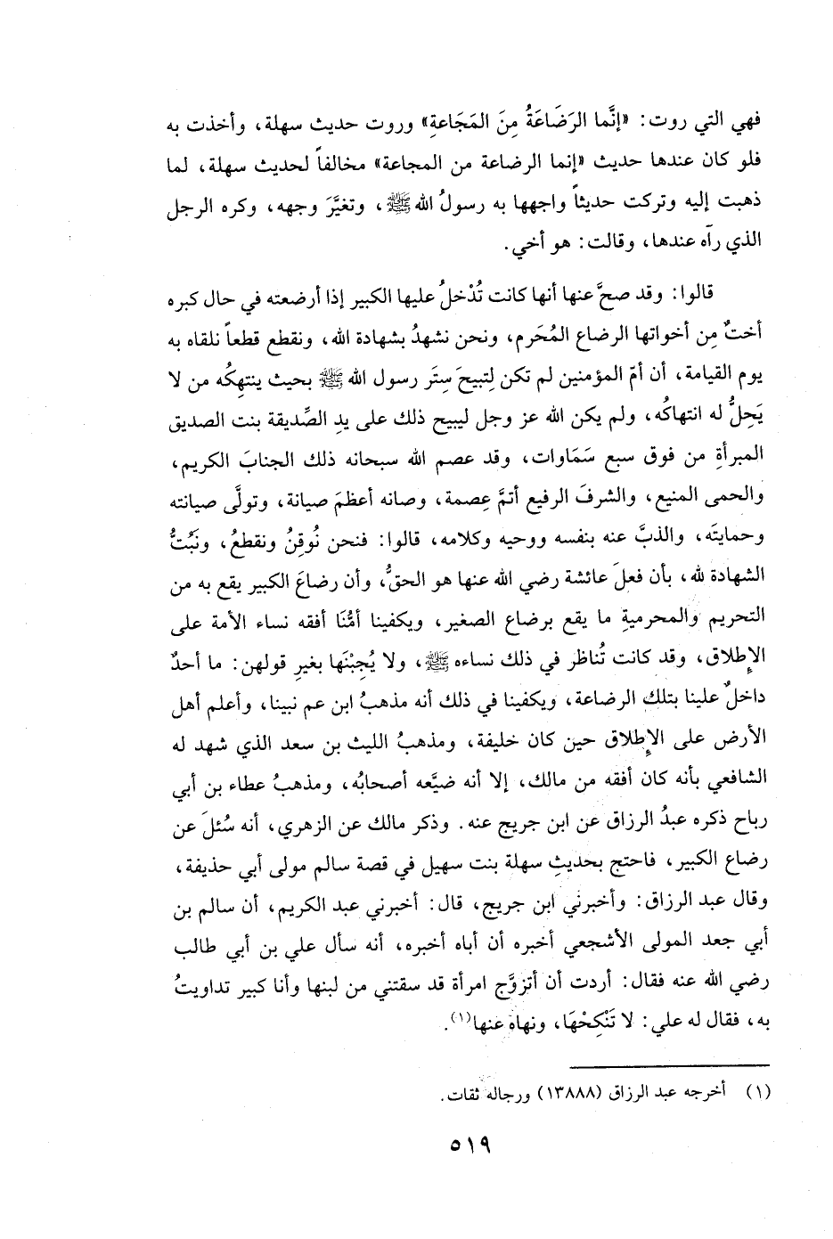 وَذَكَرَ مالك عَنِ الزُّهْرِيِّ، أَنَّهُ سُئِلَ عَنْ رَضَاعِ الْكَبِيرِ، فَاحْتَجَّ بِحَدِيثِ سهلة بنت سهيل فِي قِصَّةِ سَالِمٍ مَوْلَى أَبِي حُذَيْفَةَ، وَقَالَ عبد الرزاق: وَأَخْبَرَنِي ابْنُ جُرَيْجٍ، قَالَ: أَخْبَرَنِي عبد الكريم، أَنَّ سالم بن أبي جعد الْمَوْلَى الْأَشْجَعِيَّ أَخْبَرَهُ أَنَّ أَبَاهُ أَخْبَرَهُ، أَنَّهُ سَأَلَ عَلِيَّ بْنَ أَبِي طَالِبٍ رَضِيَ اللَّهُ عَنْهُ فَقَالَ: أَرَدْتُ أَنْ أَتَزَوَّجَ امْرَأَةً قَدْ سَقَتْنِي مِنْ لَبَنِهَا وَأَنَا كَبِيرٌ تَدَاوَيْتُ بِهِ، فَقَالَ لَهُ علي: لَا تَنْكِحْهَا، وَنَهَاهُ عَنْهَا.