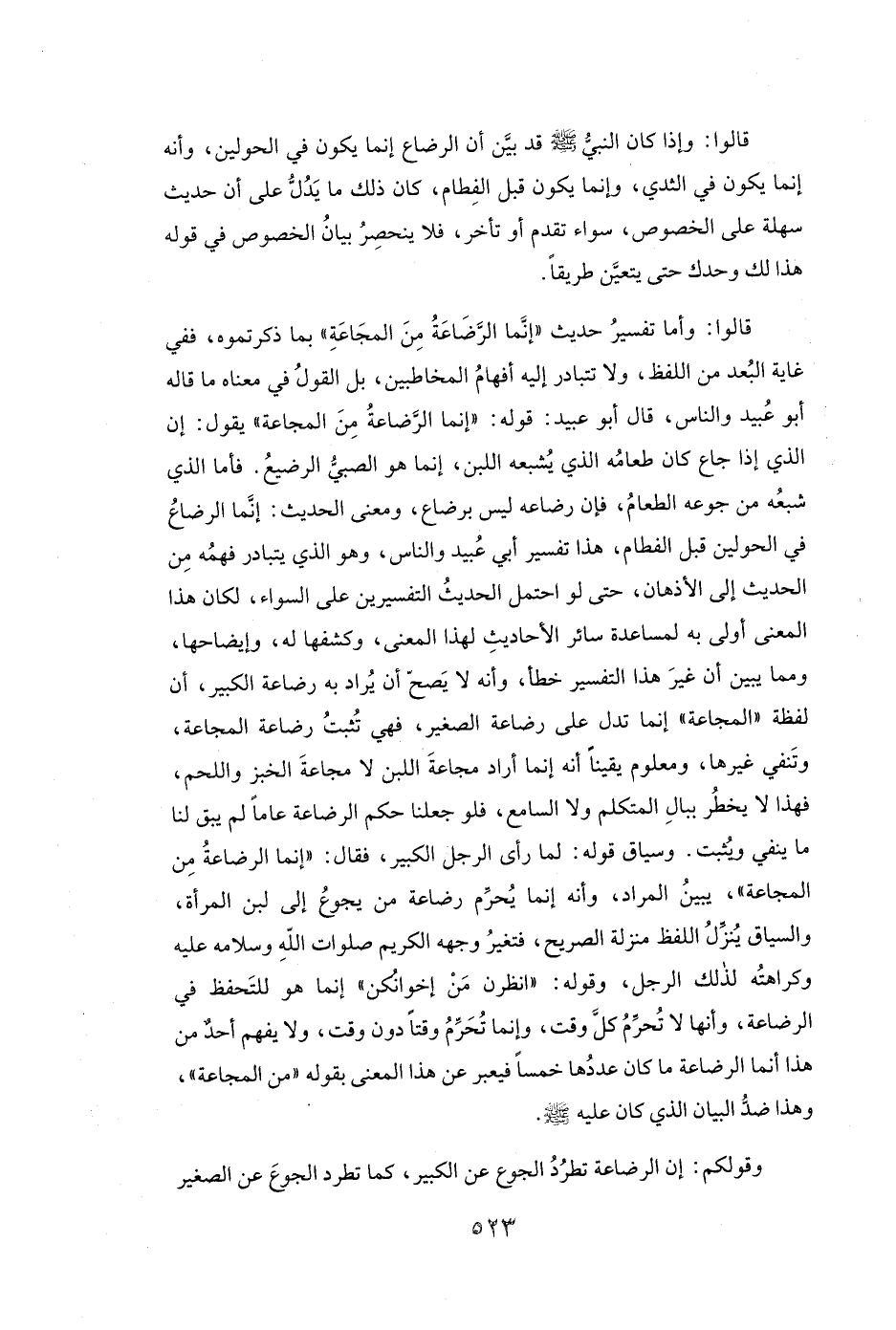 قَالُوا: وَأَمَّا تَفْسِيرُ حَدِيثِ «إِنَّمَا الرَّضَاعَةُ مِنَ الْمَجَاعَةِ» بِمَا ذَكَرْتُمُوهُ، فَفِي غَايَةِ الْبُعْدِ مِنَ اللَّفْظِ، وَلَا تَتَبَادَرُ إِلَيْهِ أَفْهَامُ الْمُخَاطَبِينَ، بَلِ الْقَوْلُ فِي مَعْنَاهُ مَا قَالَهُ أبو عبيد وَالنَّاسُ، قَالَ أبو عبيد: قَوْلُهُ: «إِنَّمَا الرَّضَاعَةُ مِنَ الْمَجَاعَةِ» يَقُولُ: إِنَّ الَّذِي إِذَا جَاعَ كَانَ طَعَامُهُ الَّذِي يُشْبِعُهُ اللَّبَنَ، إِنَّمَا هُوَ الصَّبِيُّ الرَّضِيعُ.