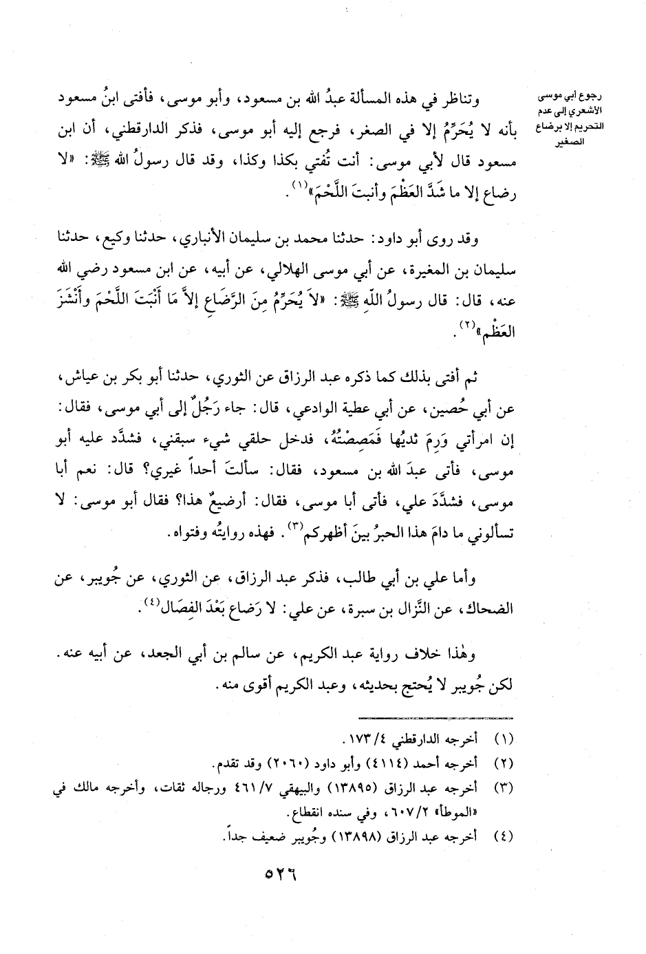 وَتَنَاظَرَ فِي هَذِهِ الْمَسْأَلَةِ عَبْدُ اللَّهِ بْنُ مَسْعُودٍ، وأبو موسى، فَأَفْتَى ابْنُ مَسْعُودٍ بِأَنَّهُ لَا يُحَرِّمُ إِلَّا فِي الصِّغَرِ، فَرَجَعَ إِلَيْهِ أبو موسى، فَذَكَرَ الدَّارَقُطْنِيُّ، أَنَّ ابْنَ مَسْعُودٍ قَالَ لأبي موسى: أَنْتَ تُفْتِي بِكَذَا وَكَذَا، وَقَدْ قَالَ رَسُولُ اللَّهِ صَلَّى اللَّهُ عَلَيْهِ وَسَلَّمَ «لَا رَضَاعَ إِلَّا مَا شَدَّ الْعَظْمَ وَأَنْبَتَ اللَّحْمَ»