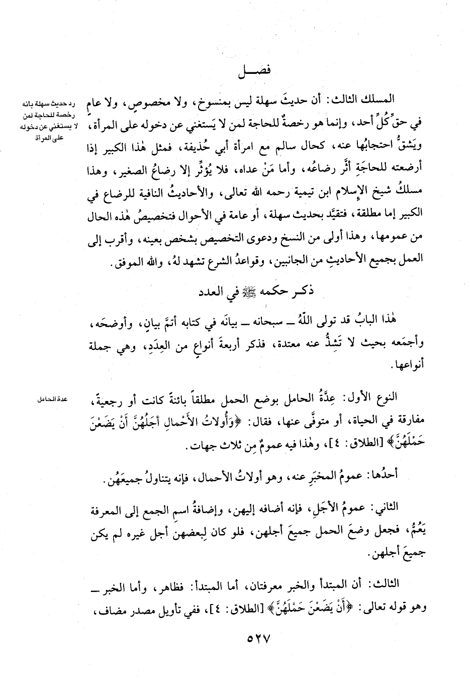 فَصْلٌ الْمَسْلَكُ الثَّالِثُ: أَنَّ حَدِيثَ سهلة لَيْسَ بِمَنْسُوخٍ، وَلَا مَخْصُوصٍ، وَلَا عَامٍّ فِي حَقِّ كُلِّ أَحَدٍ، وَإِنَّمَا هُوَ رُخْصَةٌ لِلْحَاجَةِ لِمَنْ لَا يَسْتَغْنِي عَنْ دُخُولِهِ عَلَى الْمَرْأَةِ، وَيَشُقُّ احْتِجَابُهَا عَنْهُ، كَحَالِ سالم مَعَ امْرَأَةِ أبي حذيفة، فَمِثْلُ هَذَا الْكَبِيرِ إِذَا أَرْضَعَتْهُ لِلْحَاجَةِ أَثَّرَ رَضَاعُهُ، وَأَمَّا مَنْ عَدَاهُ، فَلَا يُؤَثِّرُ إِلَّا رَضَاعُ الصَّغِيرِ، وَهَذَا مَسْلَكُ شَيْخِ الْإِسْلَامِ ابْنِ تَيْمِيَّةَ رَحِمَهُ اللَّهُ تَعَالَى، وَالْأَحَادِيثُ النَّافِيَةُ لِلرَّضَاعِ فِي الْكَبِيرِ إِمَّا مُطْلَقَةٌ، فَتُقَيَّدُ بِحَدِيثِ سهلة، أَوْ عَامَّةٌ فِي الْأَحْوَالِ فَتَخْصِيصُ هَذِهِ الْحَالِ مِنْ عُمُومِهَا، وَهَذَا أَوْلَى مِنَ النَّسْخِ وَدَعْوَى التَّخْصِيصِ بِشَخْصِ بِعَيْنِهِ، وَأَقْرَبُ إِلَى الْعَمَلِ بِجَمِيعِ الْأَحَادِيثِ مِنَ الْجَانِبَيْنِ، وَقَوَاعِدُ الشَّرْعِ تَشْهَدُ لَهُ، وَاللَّهُ الْمُوَفِّقُ.