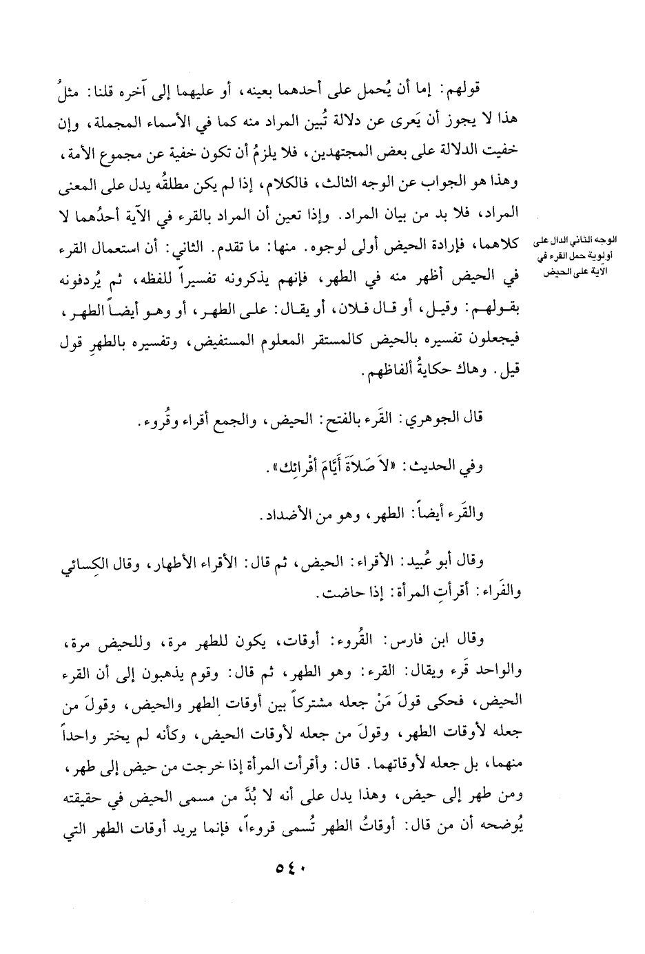 وَإِذَا تَعَيَّنَ أَنَّ الْمُرَادَ بِالْقُرْءِ فِي الْآيَةِ أَحَدُهُمَا لَا كِلَاهُمَا، فَإِرَادَةُ الْحَيْضِ أَوْلَى لِوُجُوهٍ. مِنْهَا: مَا تَقَدَّمَ. الثَّانِي: أَنَّ اسْتِعْمَالَ الْقُرْءِ فِي الْحَيْضِ أَظْهَرُ مِنْهُ فِي الطُّهْرِ، فَإِنَّهُمْ يَذْكُرُونَهُ تَفْسِيرًا لِلَفْظِهِ، ثُمَّ يُرْدِفُونَهُ بِقَوْلِهِمْ: وَقِيلَ، أَوْ قَالَ فُلَانٌ، أَوْ يُقَالُ: عَلَى الطُّهْرِ، أَوْ وَهُوَ أَيْضًا الطُّهْرُ، فَيَجْعَلُونَ تَفْسِيرَهُ بِالْحَيْضِ كَالْمُسْتَقِرِّ الْمَعْلُومِ الْمُسْتَفِيضِ، وَتَفْسِيرُهُ بِالطُّهْرِ قَوْلٌ قِيلَ. وَهَاكَ حِكَايَةَ أَلْفَاظِهِمْ.