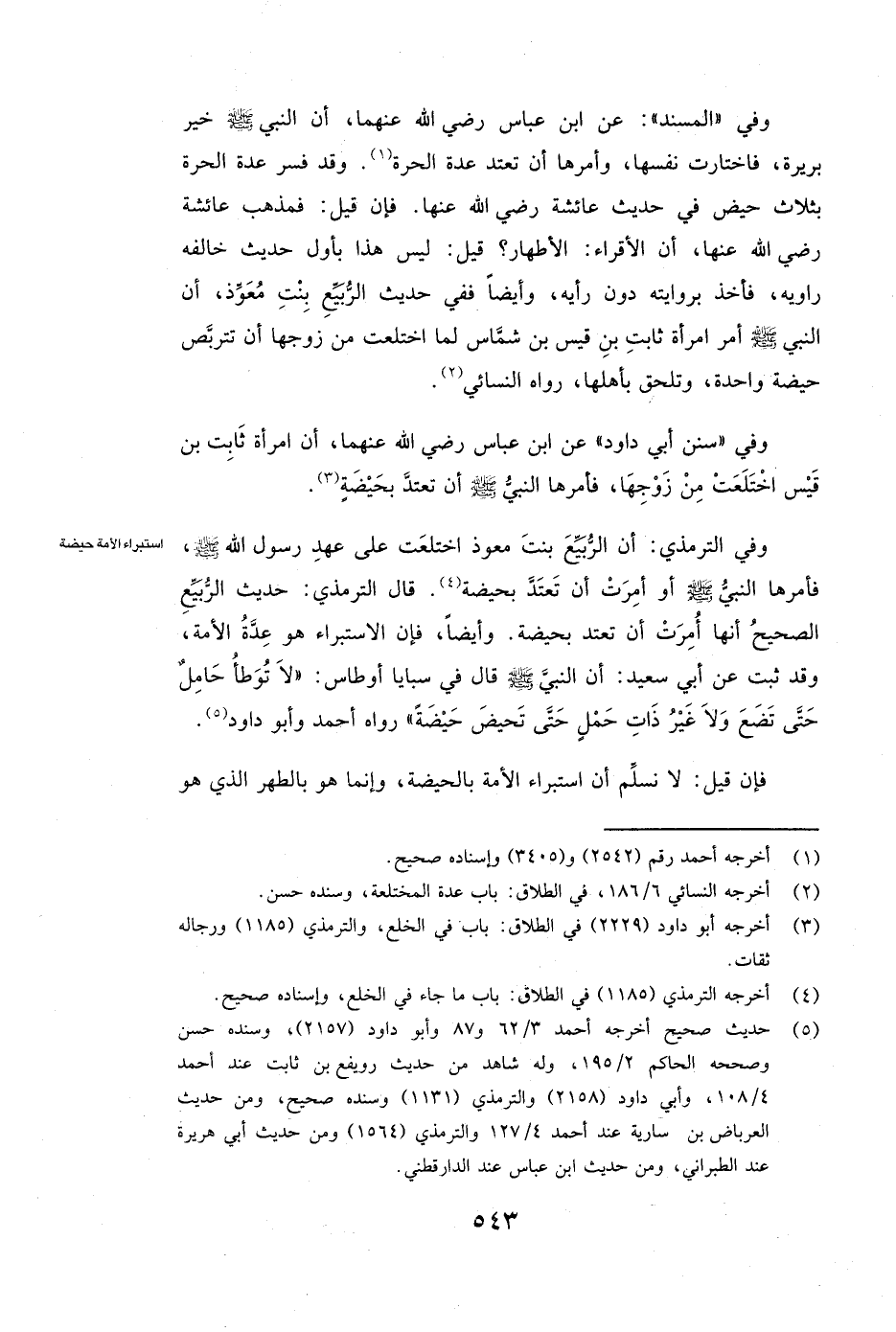 وَفِي الترمذي: «أَنَّ الربيع بنت معوذ اخْتَلَعَتْ عَلَى عَهْدِ رَسُولِ اللَّهِ صَلَّى اللَّهُ عَلَيْهِ وَسَلَّمَ، فَأَمَرَهَا النَّبِيُّ صَلَّى اللَّهُ عَلَيْهِ وَسَلَّمَ أَوْ أُمِرَتْ أَنْ تَعْتَدَّ بِحَيْضَةِ.» قَالَ الترمذي: حَدِيثُ الربيع الصَّحِيحُ أَنَّهَا أُمِرَتْ أَنْ تَعْتَدَّ بِحَيْضَةٍ. وَأَيْضًا، فَإِنَّ الِاسْتِبْرَاءَ هُوَ عِدَّةُ الْأَمَةِ، وَقَدْ ثَبَتَ عَنْ أبي سعيد: «أَنَّ النَّبِيَّ صَلَّى اللَّهُ عَلَيْهِ وَسَلَّمَ قَالَ فِي سَبَايَا أَوْطَاسٍ: لَا تُوطَأُ حَامِلٌ حَتَّى تَضَعَ وَلَا غَيْرُ ذَاتِ حَمْلٍ حَتَى تَحِيضَ حَيْضَةً» رَوَاهُ أحمد وأبو داود.