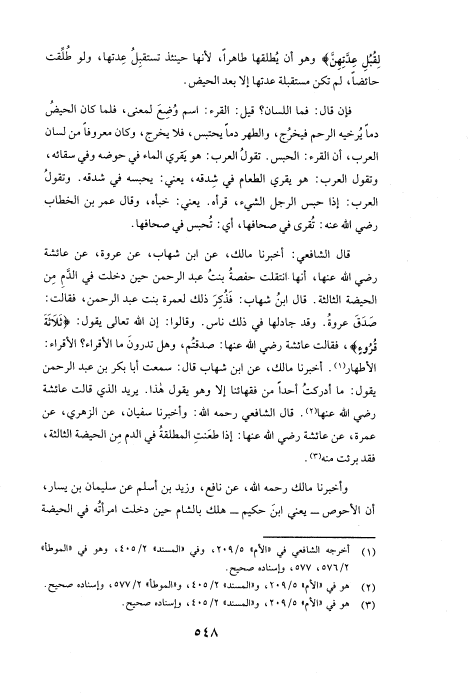 قَالَ الشَّافِعِيُّ: أَخْبَرَنَا مالك، عَنِ ابْنِ شِهَابٍ، عَنْ عروة، عَنْ عائشة رَضِيَ اللَّهُ عَنْهَا أَنَّهَا انْتَقَلَتْ حفصة بنت عبد الرحمن حِينَ دَخَلَتْ فِي الدَّمِ مِنَ الْحَيْضَةِ الثَّالِثَةِ. قَالَ ابْنُ شِهَابٍ: فَذُكِرَ ذَلِكَ لعمرة بنت عبد الرحمن، فَقَالَتْ: صَدَقَ عروة. وَقَدْ جَادَلَهَا فِي ذَلِكَ نَاسٌ. وَقَالُوا: إِنَّ اللَّهَ تَعَالَى يَقُولُ {ثَلَاثَةَ قُرُوءٍ} [البقرة: 228] فَقَالَتْ عائشة رَضِيَ اللَّهُ عَنْهَا: صَدَقْتُمْ، وَهَلْ تَدْرُونَ مَا الْأَقْرَاءُ؟ الْأَقْرَاءُ: الْأَطْهَارُ.