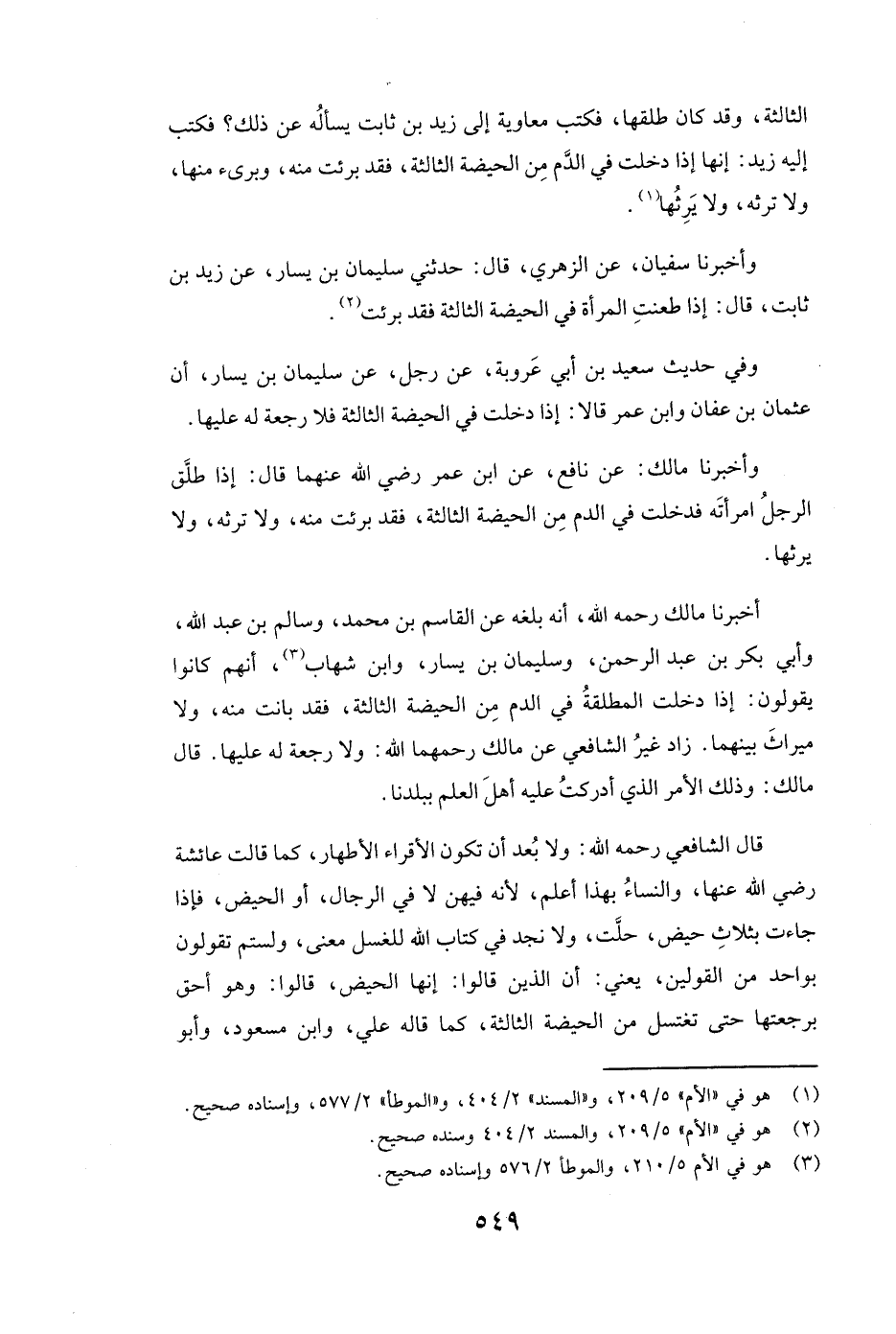 أَخْبَرَنَا مالك رَحِمَهُ اللَّهُ أَنَّهُ بَلَغَهُ عَنِ الْقَاسِمِ بْنِ مُحَمَّدٍ، وَسَالِمِ بْنِ عَبْدِ اللَّهِ، وَأَبِي بَكْرِ بْنِ عَبْدِ الرَّحْمَنِ، وَسُلَيْمَانَ بْنِ يَسَارٍ، وَابْنِ شِهَابٍ، أَنَّهُمْ كَانُوا يَقُولُونَ: إِذَا دَخَلَتِ الْمُطَلَّقَةُ فِي الدَّمِ مِنَ الْحَيْضَةِ الثَّالِثَةِ، فَقَدْ بَانَتْ مِنْهُ، وَلَا مِيرَاثَ بَيْنَهُمَا. زَادَ غَيْرُ الشَّافِعِيِّ عَنْ مالك رَحِمَهُمَا اللَّهُ: وَلَا رَجْعَةَ لَهُ عَلَيْهَا. قَالَ مالك: وَذَلِكَ الْأَمْرُ الَّذِي أَدْرَكْتُ عَلَيْهِ أَهْلَ الْعِلْمِ بِبَلَدِنَا.
