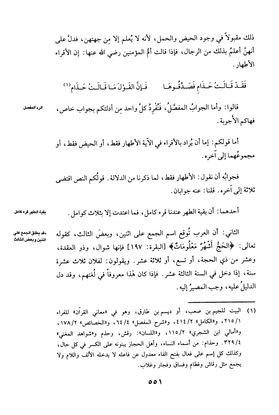الثَّانِي: أَنَّ الْعَرَبَ تُوقِعُ اسْمَ الْجَمْعِ عَلَى اثْنَيْنِ، وَبَعْضِ الثَّالِثِ، كَقَوْلِهِ تَعَالَى: {الْحَجُّ أَشْهُرٌ مَعْلُومَاتٌ} [البقرة: 197] [الْبَقَرَةِ: 197] فَإِنَّهَا شَوَّالٌ، وَذُو الْقَعْدَةِ، وَعَشْرٌ مِنْ ذِي الْحِجَّةِ، أَوْ تِسْعٌ، أَوْ ثَلَاثَةَ عَشَرَ. وَيَقُولُونَ: لِفُلَانٍ ثَلَاثَ عَشْرَةَ سَنَةً، إِذْ دَخَلَ فِي السَّنَةِ الثَّالِثَةَ عَشَرَ. فَإِذَا كَانَ هَذَا مَعْرُوفًا فِي لُغَتِهِمْ، وَقَدْ دَلَّ الدَّلِيلُ عَلَيْهِ، وَجَبَ الْمَصِيرُ إِلَيْهِ.