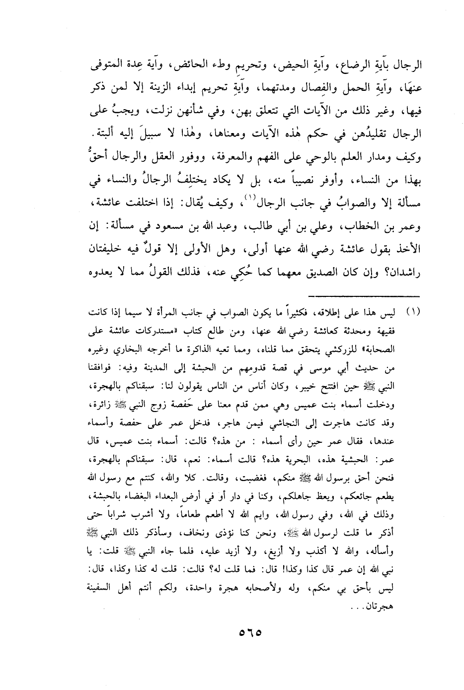 الرِّجَالِ بِآيَةِ الرَّضَاعِ، وَآيَةِ الْحَيْضِ، وَتَحْرِيمِ وَطْءِ الْحَائِضِ، وَآيَةِ عِدَّةِ الْمُتَوَفَّى عَنْهَا، وَآيَةِ الْحَمْلِ وَالْفِصَالِ وَمُدَّتِهِمَا، وَآيَةِ تَحْرِيمِ إِبْدَاءِ الزِّينَةِ إِلَّا لِمَنْ ذُكِرَ فِيهَا، وَغَيْرِ ذَلِكَ مِنَ الْآيَاتِ الَّتِي تَتَعَلَّقُ بِهِنَّ، وَفِي شَأْنِهِنَّ نَزَلَتْ، وَيَجِبُ عَلَى الرِّجَالِ تَقْلِيدُهُنَّ فِي حُكْمِ هَذِهِ الْآيَاتِ وَمَعْنَاهَا، وَهَذَا لَا سَبِيلَ إِلَيْهِ الْبَتَّةَ. وَكَيْفَ وَمَدَارُ الْعِلْمِ بِالْوَحْيِ عَلَى الْفَهْمِ وَالْمَعْرِفَةِ، وَوُفُورِ الْعَقْلِ وَالرِّجَالُ أَحَقُّ بِهَذَا مِنَ النِّسَاءِ، وَأَوْفَرُ نَصِيبًا مِنْهُ، بَلْ لَا يَكَادُ يَخْتَلِفُ الرِّجَالُ وَالنِّسَاءُ فِي مَسْأَلَةٍ إِلَّا وَالصَّوَابُ فِي جَانِبِ الرِّجَالِ، وَكَيْفَ يُقَالُ: إِذَا اخْتَلَفَتْ عائشة، وَعُمَرُ بْنُ الْخَطَّابِ، وَعَلِيُّ بْنُ أَبِي طَالِبٍ، وَعَبْدُ اللَّهِ بْنُ مَسْعُودٍ فِي مَسْأَلَةٍ: إِنَّ الْأَخْذَ بِقَوْلِ عائشة رَضِيَ اللَّهُ عَنْهَا أَوْلَى، وَهَلِ الْأَوْلَى إِلَّا قَوْلٌ فِيهِ خَلِيفَتَانِ رَاشِدَانِ؟ وَإِنْ كَانَ الصِّدِّيقُ مَعَهُمَا كَمَا حُكِيَ عَنْهُ، فَذَلِكَ الْقَوْلُ مِمَّا لَا يَعْدُوهُ