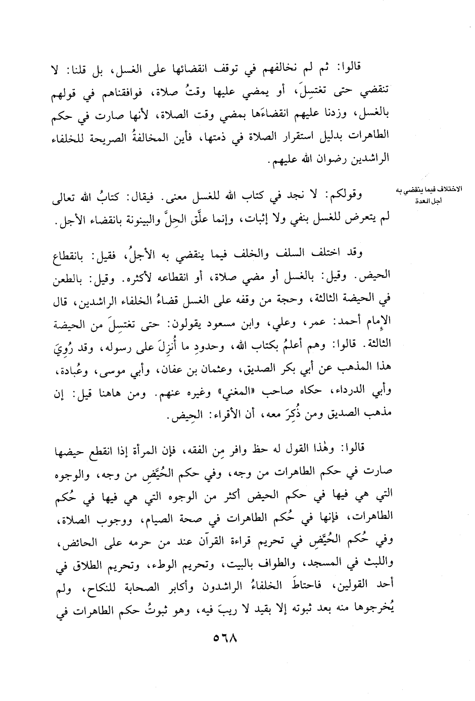 قَالُوا: ثُمَّ لَمْ نُخَالِفْهُمْ فِي تَوَقُّفِ انْقِضَائِهَا عَلَى الْغُسْلِ، بَلْ قُلْنَا: لَا تَنْقَضِي حَتَّى تَغْتَسِلَ، أَوْ يَمْضِيَ عَلَيْهَا وَقْتُ صَلَاةٍ، فَوَافَقْنَاهُمْ فِي قَوْلِهِمْ بِالْغُسْلِ، وَزِدْنَا عَلَيْهِمُ انْقِضَاءَهَا بِمُضِيِّ وَقْتِ الصَّلَاةِ؛ لِأَنَّهَا صَارَتْ فِي حُكْمِ الطَّاهِرَاتِ بِدَلِيلِ اسْتِقْرَارِ الصَّلَاةِ فِي ذِمَّتِهَا، فَأَيْنَ الْمُخَالَفَةُ الصَّرِيحَةُ لِلْخُلَفَاءِ الرَّاشِدِينَ رِضْوَانُ اللَّهِ عَلَيْهِمْ.