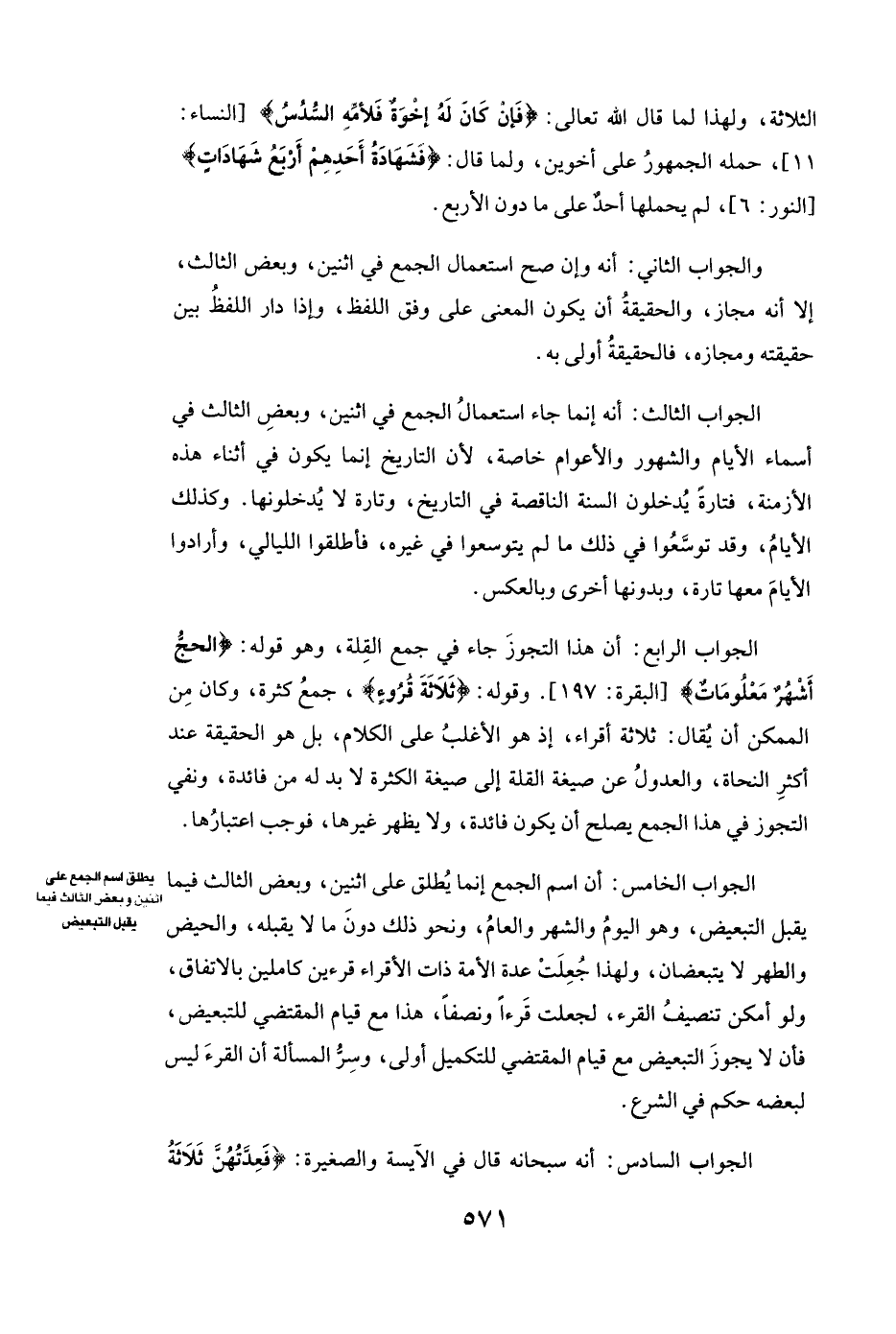 الْجَوَابُ الثَّالِثُ: أَنَّهُ إِنَّمَا جَاءَ اسْتِعْمَالُ الْجَمْعِ فِي اثْنَيْنِ، وَبَعْضِ الثَّالِثِ فِي أَسْمَاءِ الْأَيَّامِ وَالشُّهُورِ وَالْأَعْوَامِ خَاصَّةً؛ لِأَنَّ التَّارِيخَ إِنَّمَا يَكُونُ فِي أَثْنَاءِ هَذِهِ الْأَزْمِنَةِ، فَتَارَةً يُدْخِلُونَ السَّنَةَ النَّاقِصَةَ فِي التَّارِيخِ وَتَارَةً لَا يُدْخِلُونَهَا. وَكَذَلِكَ الْأَيَّامُ، وَقَدْ تَوَسَّعُوا فِي ذَلِكَ مَا لَمْ يَتَوَسَّعُوا فِي غَيْرِهِ، فَأَطْلَقُوا اللَّيَالِيَ وَأَرَادُوا الْأَيَّامَ مَعَهَا تَارَةً وَبِدُونِهَا أُخْرَى وَبِالْعَكْسِ.