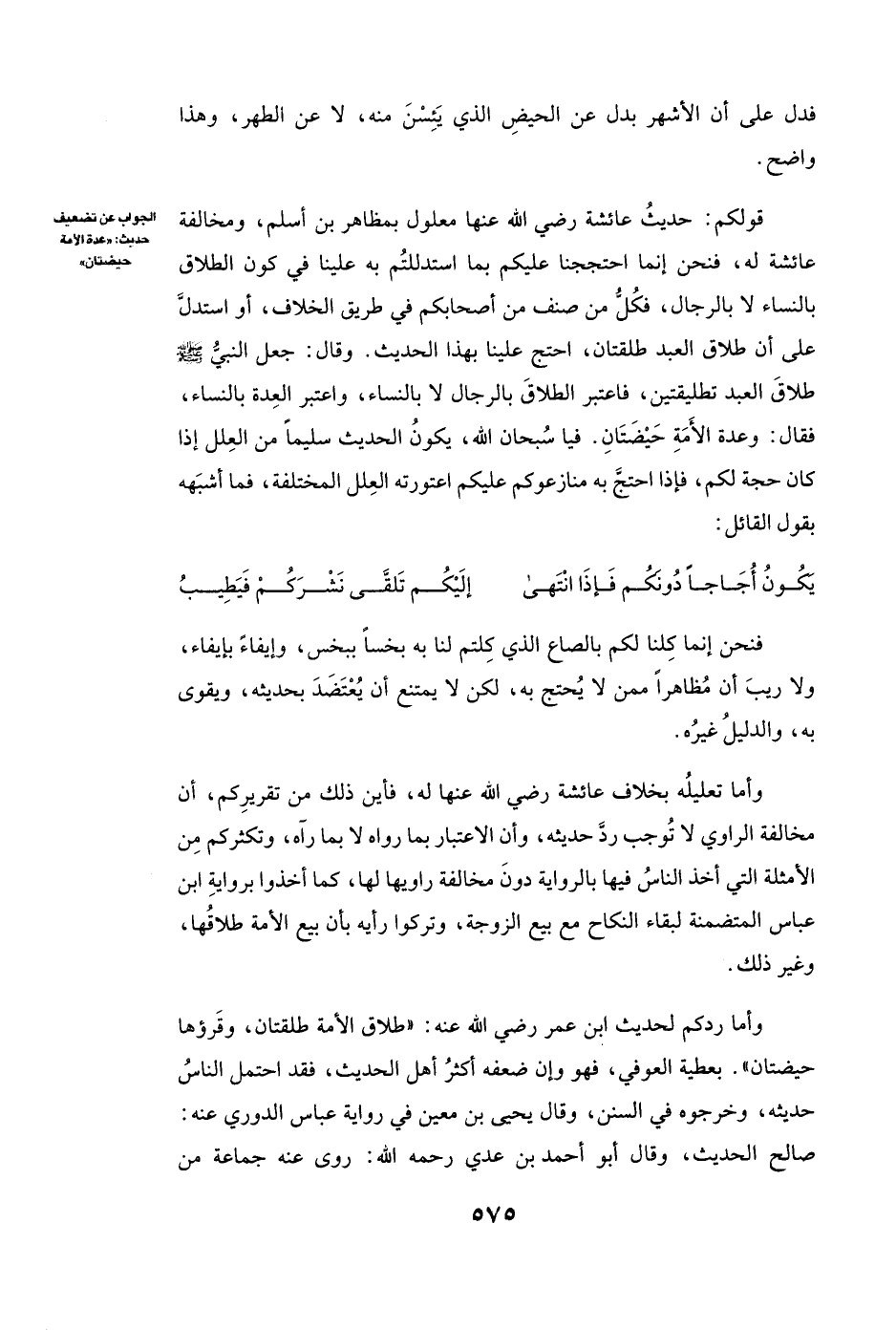 وَأَمَّا رَدُّكُمْ لِحَدِيثِ ابْنِ عُمَرَ رَضِيَ اللَّهُ عَنْهُ: ( «طَلَاقُ الْأَمَةِ طَلْقَتَانِ وَقَرْؤُهَا حَيْضَتَانِ» ) بعطية العوفي، فَهُوَ وَإِنْ ضَعَّفَهُ أَكْثَرُ أَهْلِ الْحَدِيثِ، فَقَدِ احْتَمَلَ النَّاسُ حَدِيثَهُ وَخَرَّجُوهُ فِي السُّنَنِ، وَقَالَ يَحْيَى بْنُ مَعِينٍ فِي رِوَايَةِ عَبَّاسٍ الدُّورِيِّ عَنْهُ صَالِحُ الْحَدِيثِ، وَقَالَ أَبُو أَحْمَدَ بْنُ عَدِيٍّ رَحِمَهُ اللَّهُ: رَوَى عَنْهُ جَمَاعَةٌ مِنْ