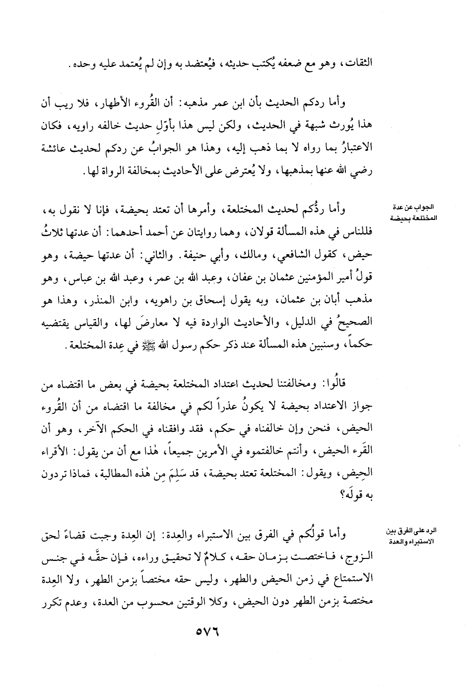 وَأَمَّا رَدُّكُمُ الْحَدِيثَ بِأَنَّ ابْنَ عُمَرَ مَذْهَبُهُ: أَنَّ الْقُرُوءَ الْأَطْهَارُ، فَلَا رَيْبَ أَنَّ هَذَا يُورِثُ شُبْهَةً فِي الْحَدِيثِ، وَلَكِنْ لَيْسَ هَذَا بِأَوَّلِ حَدِيثٍ خَالَفَهُ رَاوِيهِ، فَكَانَ الِاعْتِبَارُ بِمَا رَوَاهُ لَا بِمَا ذَهَبَ إِلَيْهِ:، وَهَذَا هُوَ الْجَوَابُ عَنْ رَدِّكُمْ لِحَدِيثِ عائشة رَضِيَ اللَّهُ عَنْهَا بِمَذْهَبِهَا، وَلَا يُعْتَرَضُ عَلَى الْأَحَادِيثِ بِمُخَالَفَةِ الرُّوَاةِ لَهَا.