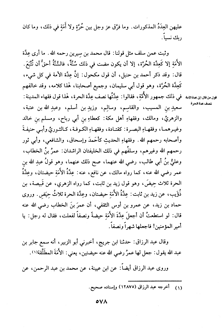 وَثَبَتَ عَمَّنْ سَلَفَ مِثْلُ قَوْلِنَا: قَالَ مُحَمَّدُ بْنُ سِيرِينَ رَحِمَهُ اللَّهُ: مَا أَرَى عِدَّةَ الْأَمَةِ إِلَّا كَعِدَّةِ الْحُرَّةِ إِلَّا أَنْ يَكُونَ مَضَتْ فِي ذَلِكَ سُنَّةٌ، فَالسُّنَّةُ أَحَقُّ أَنْ تُتَّبَعَ. قَالَ: وَقَدْ ذَكَرَ أَحْمَدُ بْنُ حَنْبَلٍ أَنَّ قَوْلَ مكحول: إِنَّ عِدَّةَ الْأَمَةِ فِي كُلِّ شَيْءٍ كَعِدَّةِ الْحُرَّةِ، وَهُوَ قَوْلُ أبي سليمان وَجَمِيعِ أَصْحَابِنَا هَذَا كَلَامُهُ.