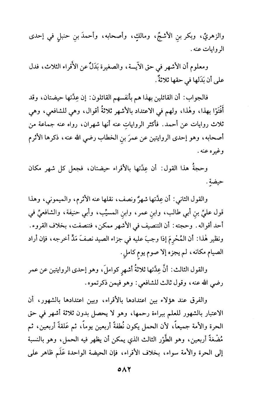 فَالْجَوَابُ أَنَّ الْقَائِلِينَ بِهَذَا هُمْ بِأَنْفُسِهِمُ الْقَائِلُونَ إِنَّ عِدَّتَهَا حَيْضَتَانِ وَقَدْ أَفْتَوْا بِهَذَا، وَهَذَا وَلَهُمْ فِي الِاعْتِدَادِ بِالْأَشْهُرِ ثَلَاثَةُ أَقْوَالٍ وَهِيَ لِلشَّافِعِيِّ وَهِيَ ثَلَاثُ رِوَايَاتٍ عَنْ أحمد. فَأَكْثَرُ الرِّوَايَاتِ عَنْهُ أَنَّهَا شَهْرَانِ رَوَاهُ عَنْهُ جَمَاعَةٌ مِنْ أَصْحَابِهِ، وَهُوَ إِحْدَى الرِّوَايَتَيْنِ عَنْ عُمَرَ بْنِ الْخَطَّابِ رَضِيَ اللَّهُ عَنْهُ ذَكَرَهَا الأثرم وَغَيْرُهُ عَنْهُ.