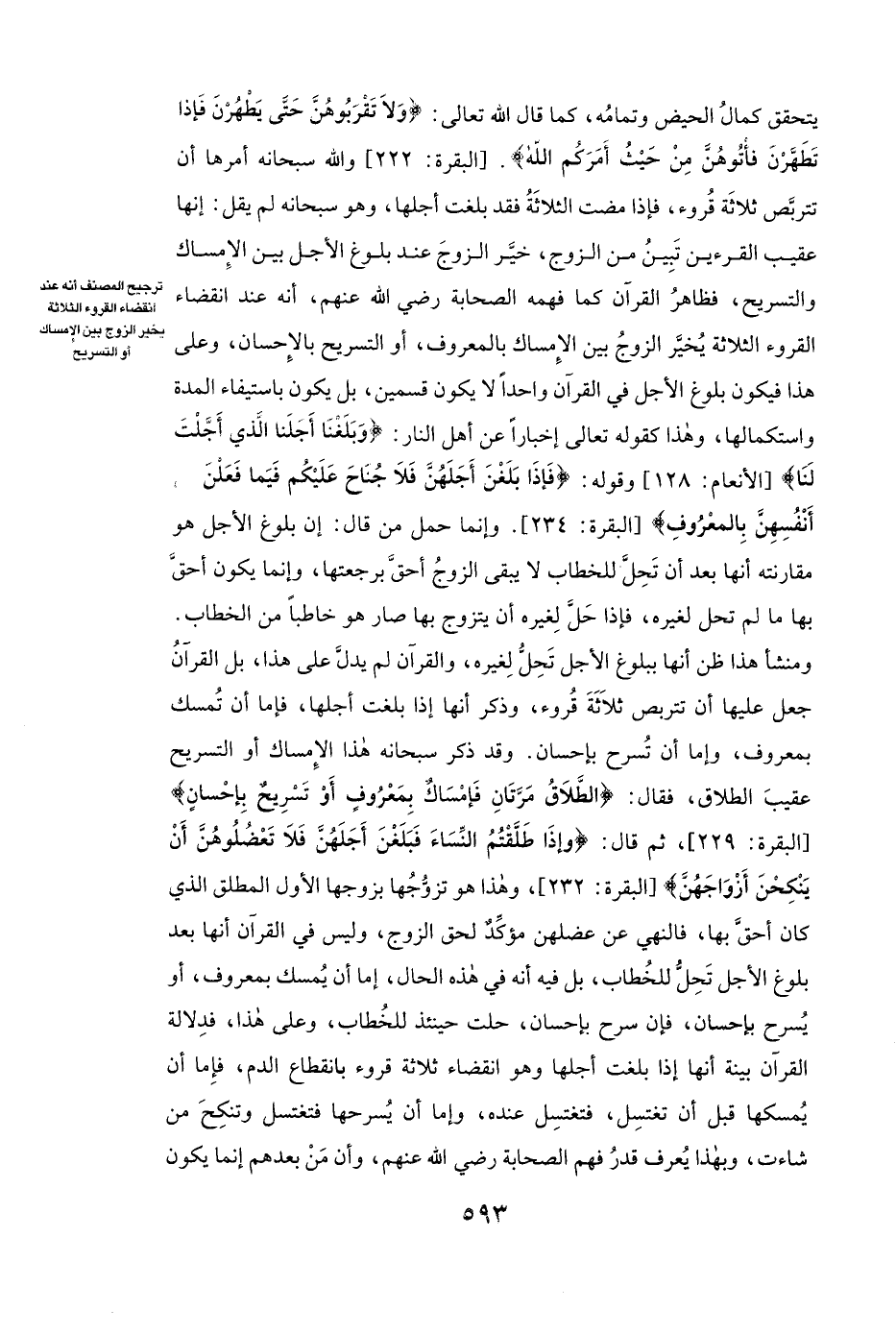 يَتَحَقَّقُ كَمَالُ الْحَيْضِ وَتَمَامُهُ كَمَا قَالَ اللَّهُ تَعَالَى: {وَلَا تَقْرَبُوهُنَّ حَتَّى يَطْهُرْنَ فَإِذَا تَطَهَّرْنَ فَأْتُوهُنَّ مِنْ حَيْثُ أَمَرَكُمُ اللَّهُ} [البقرة: 222] [الْبَقَرَةِ 222] وَاللَّهُ سُبْحَانَهُ أَمَرَهَا أَنْ تَتَرَبَّصَ ثَلَاثَةَ قُرُوءٍ، فَإِذَا مَضَتِ الثَّلَاثَةُ فَقَدْ بَلَغَتْ أَجَلَهَا، وَهُوَ سُبْحَانُهُ لَمْ يَقُلْ إِنَّهَا عَقِيبَ الْقَرْأَيْنِ تَبِينُ مِنَ الزَّوْجِ، خَيَّرَ الزَّوْجَ عِنْدَ بُلُوغِ الْأَجَلِ بَيْنَ الْإِمْسَاكِ وَالتَّسْرِيحِ، فَظَاهِرُ الْقُرْآنِ كَمَا فَهِمَهُ الصَّحَابَةُ رَضِيَ اللَّهُ عَنْهُمْ أَنَّهُ عِنْدَ انْقِضَاءِ الْقُرُوءِ الثَّلَاثَةِ يُخَيَّرُ الزَّوْجُ بَيْنَ الْإِمْسَاكِ بِالْمَعْرُوفِ، أَوِ التَّسْرِيحِ بِالْإِحْسَانِ، وَعَلَى هَذَا فَيَكُونُ بُلُوغُ الْأَجَلِ فِي الْقُرْآنِ وَاحِدًا لَا يَكُونُ قِسْمَيْنِ، بَلْ يَكُونُ بِاسْتِيفَاءِ الْمُدَّةِ وَاسْتِكْمَالِهَا.