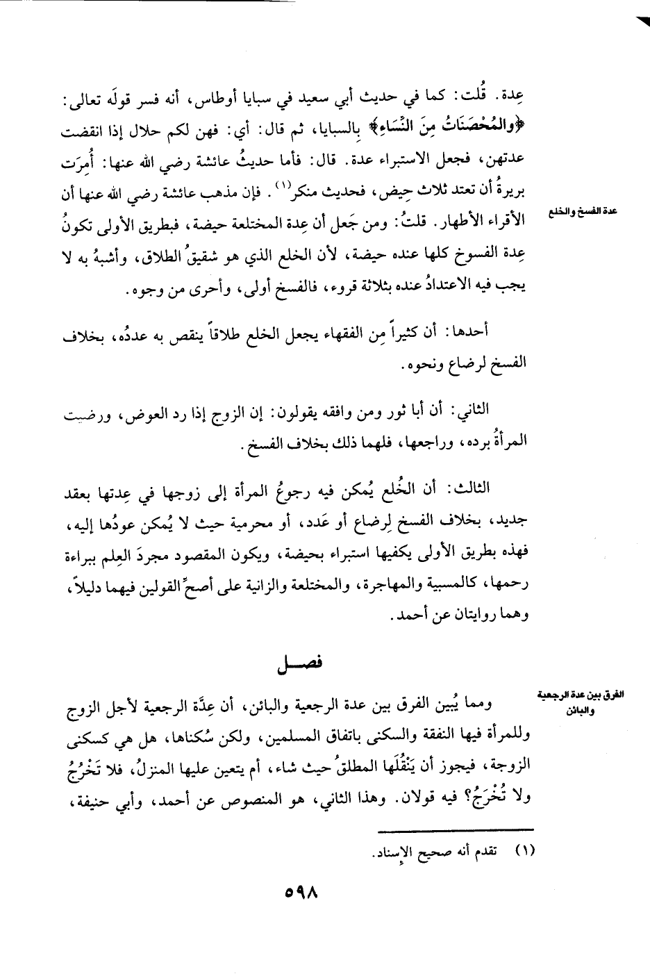 عِدَّةً. قُلْتُ: كَمَا فِي حَدِيثِ أبي سعيد فِي سَبَايَا أَوْطَاسٍ أَنَّهُ فَسَّرَ قَوْلَهُ تَعَالَى: {وَالْمُحْصَنَاتُ مِنَ النِّسَاءِ} [النساء: 24] بِالسَّبَايَا، ثُمَّ قَالَ: أَيْ فَهُنَّ لَكُمْ حَلَالٌ إِذَا انْقَضَتْ عِدَّتُهُنَّ فَجَعَلَ الِاسْتِبْرَاءَ عِدَّةً. قَالَ فَأَمَّا حَدِيثُ ( «عائشة رَضِيَ اللَّهُ عَنْهَا: أُمِرَتْ بريرة أَنْ تَعْتَدَّ ثَلَاثَ حِيَضٍ» ) فَحَدِيثٌ مُنْكَرٌ؛ فَإِنَّ مَذْهَبَ عائشة رَضِيَ اللَّهُ عَنْهَا أَنَّ الْأَقْرَاءَ الْأَطْهَارُ. قُلْتُ: وَمَنْ جَعَلَ أَنَّ عِدَّةَ الْمُخْتَلِعَةِ حَيْضَةٌ فَبِطَرِيقِ الْأَوْلَى تَكُونُ عِدَّةُ الْفُسُوخِ كُلِّهَا عِنْدَهُ حَيْضَةً؛ لِأَنَّ الْخُلْعَ الَّذِي هُوَ شَقِيقُ الطَّلَاقِ وَأَشْبَهُ بِهِ لَا يَجِبُ فِيهِ الِاعْتِدَادُ عِنْدَهُ بِثَلَاثَةِ قُرُوءٍ، فَالْفَسْخُ أَوْلَى وَأَحْرَى مِنْ وُجُوهٍ.