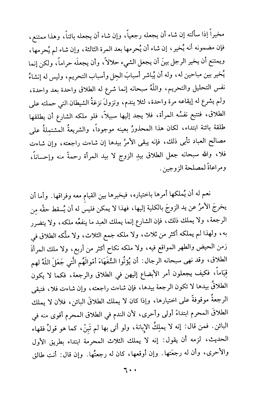 مُخَيَّرًا إِذَا سَأَلَتْهُ إِنْ شَاءَ أَنْ يَجْعَلَهُ رَجْعِيًّا وَإِنْ شَاءَ أَنْ يَجْعَلَهُ بَائِنًا، وَهَذَا مُمْتَنِعٌ، فَإِنَّ مَضْمُونَهُ أَنَّهُ يُخَيَّرُ إِنْ شَاءَ أَنْ يُحَرِّمَهَا بَعْدَ الْمَرَّةِ الثَّالِثَةِ، وَإِنْ شَاءَ لَمْ يُحَرِّمْهَا، وَيَمْتَنِعُ أَنْ يُخَيَّرَ الرَّجُلُ بَيْنَ أَنْ يُجْعَلَ الشَّيْءُ حَلَالًا وَأَنْ يَجْعَلَهُ حَرَامًا، وَلَكِنْ إِنَّمَا يُخَيَّرُ بَيْنَ مُبَاحَيْنِ لَهُ، وَلَهُ أَنْ يُبَاشِرَ أَسْبَابَ الْحِلِّ وَأَسْبَابَ التَّحْرِيمِ، وَلَيْسَ لَهُ إِنْشَاءُ نَفْسِ التَّحْلِيلِ وَالتَّحْرِيمِ، وَاللَّهُ سُبْحَانَهُ إِنَّمَا شَرَعَ لَهُ الطَّلَاقَ وَاحِدَةً بَعْدَ وَاحِدَةٍ، وَلَمْ يَشْرَعْ لَهُ إِيقَاعَهُ مَرَّةً وَاحِدَةً لِئَلَّا يَنْدَمَ وَتَزُولَ نَزْغَةُ الشَّيْطَانِ الَّتِي حَمَلَتْهُ عَلَى الطَّلَاقِ فَتَتْبَعُ نَفْسُهُ الْمَرْأَةَ فَلَا يَجِدُ إِلَيْهَا سَبِيلًا، فَلَوْ مَلَّكَهُ الشَّارِعُ أَنْ يُطَلِّقَهَا طَلْقَةً بَائِنَةً ابْتِدَاءً لَكَانَ هَذَا الْمَحْذُورُ بِعَيْنِهِ مَوْجُودًا، وَالشَّرِيعَةُ الْمُشْتَمِلَةُ عَلَى مَصَالِحِ الْعِبَادِ تَأْبَى ذَلِكَ، فَإِنَّهُ يَبْقَى الْأَمْرُ بِيَدِهَا إِنْ شَاءَتْ رَاجَعَتْهُ وَإِنْ شَاءَتْ فَلَا، وَاللَّهُ سُبْحَانَهُ جَعَلَ الطَّلَاقَ بِيَدِ الزَّوْجِ لَا بِيَدِ الْمَرْأَةِ رَحْمَةً مِنْهُ وَإِحْسَانًا وَمُرَاعَاةً لِمَصْلَحَةِ الزِّوْجَيْنِ.