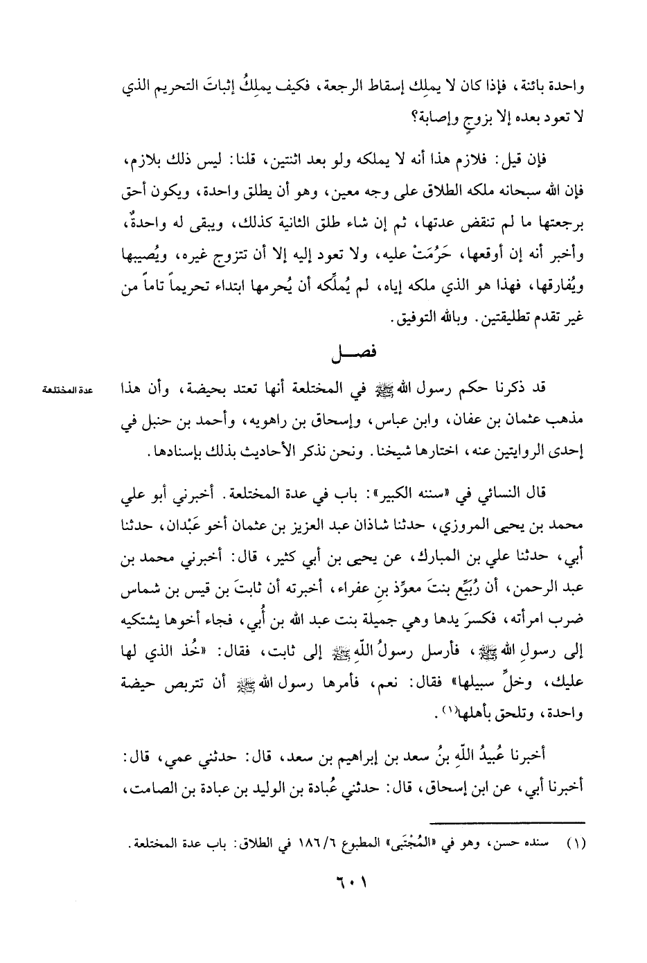 قَالَ النَّسَائِيُّ فِي " سُنَنِهِ الْكَبِيرِ ": بَابٌ فِي عِدَّةِ الْمُخْتَلِعَةِ. أَخْبَرَنِي أبو علي محمد بن يحيى المروزي حَدَّثَنَا شاذان عبد العزيز بن عثمان أخو عبدان حَدَّثَنَا أَبِي حَدَّثَنَا علي بن المبارك، عَنْ يَحْيَى بْنِ أَبِي كَثِيرٍ قَالَ أَخْبَرَنِي محمد بن عبد الرحمن أَنَّ ( «ربيع بنت معوذ بن عفراء أَخْبَرَتْهُ أَنَّ ثَابِتَ بْنَ قَيْسِ بْنِ شَمَّاسٍ ضَرَبَ امْرَأَتَهُ فَكَسَرَ يَدَهَا وَهِيَ جميلة بنت عبد الله بن أبي فجاء أَخُوهَا يَشْتَكِيهِ إِلَى رَسُولِ اللَّهِ صَلَّى اللَّهُ عَلَيْهِ وَسَلَّمَ فَأَرْسَلَ رَسُولُ اللَّهِ صَلَّى اللَّهُ عَلَيْهِ وَسَلَّمَ إِلَى ثَابِتٍ فَقَالَ: خُذِ الَّذِي لَهَا عَلَيْكَ وَخَلِّ سَبِيلَهَا. فَقَالَ: نَعَمْ. فَأَمَرَهَا رَسُولُ اللَّهِ صَلَّى اللَّهُ عَلَيْهِ وَسَلَّمَ أَنْ تَتَرَبَّصَ حَيْضَةً وَاحِدَةً وَتَلْحَقَ بِأَهْلِهَا» )