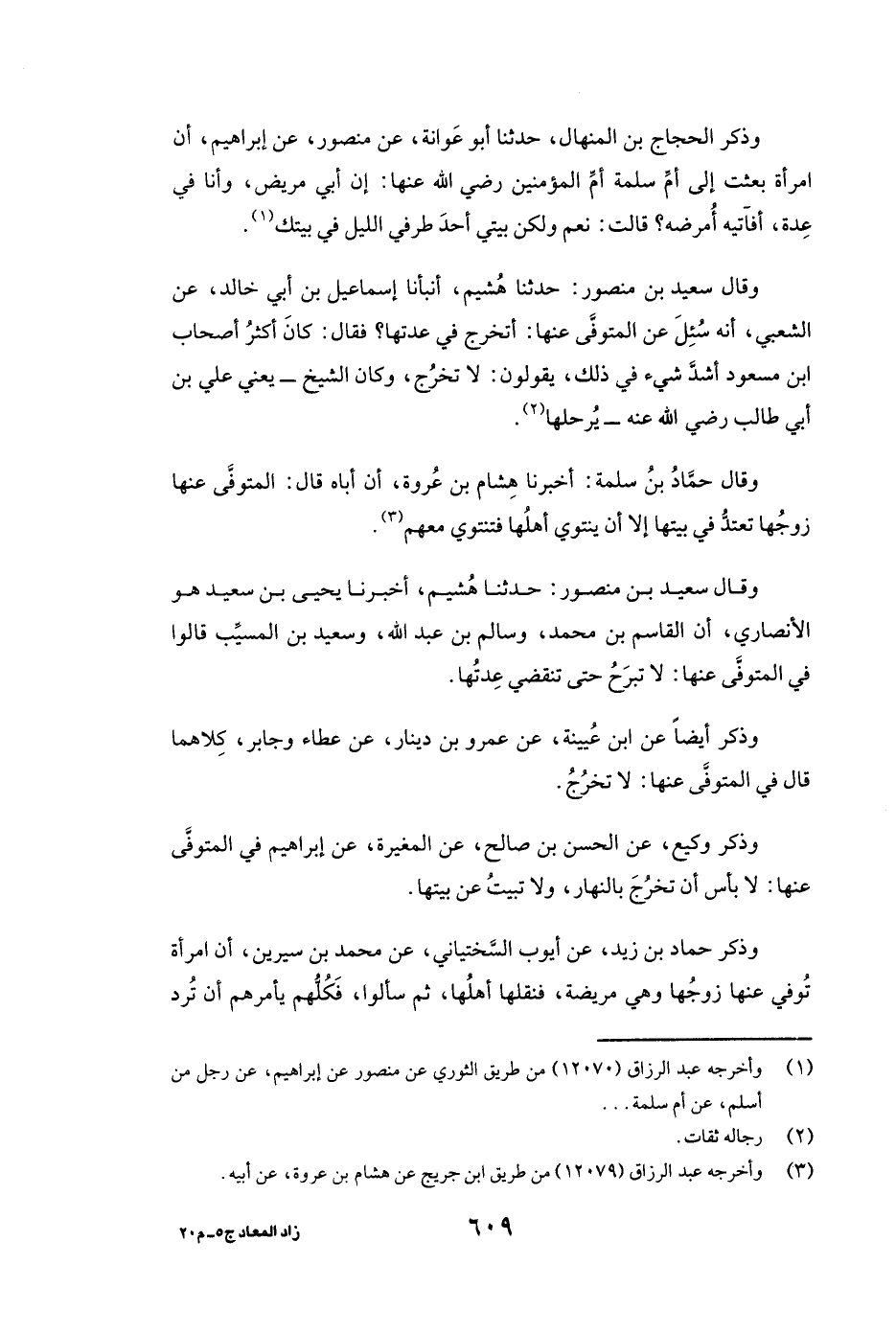 وَقَالَ سَعِيدُ بْنُ مَنْصُورٍ: حَدَّثَنَا هشيم، أَنْبَأَنَا إِسْمَاعِيلُ بْنُ أَبِي خَالِدٍ، عَنِ الشَّعْبِيِّ أَنَّهُ سُئِلَ عَنِ الْمُتَوَفَّى عَنْهَا: أَتَخْرُجُ فِي عِدَّتِهَا؟ فَقَالَ: (كَانَ أَكْثَرُ أَصْحَابِ ابْنِ مَسْعُودٍ أَشَدَّ شَيْءٍ فِي ذَلِكَ يَقُولُونَ: لَا تَخْرُجُ وَكَانَ الشَّيْخُ - يَعْنِي عَلِيَّ بْنَ أَبِي طَالِبٍ رَضِيَ اللَّهُ عَنْهُ - يُرَحِّلُهَا)