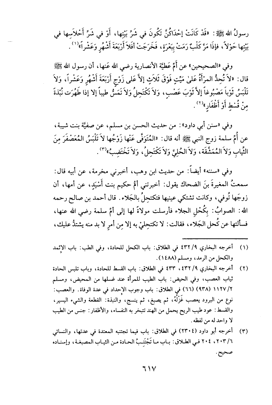وَفِي " الصَّحِيحَيْنِ "، عَنْ أم عطية الأنصارية رَضِيَ اللَّهُ عَنْهَا أَنَّ رَسُولَ اللَّهِ صَلَّى اللَّهُ عَلَيْهِ وَسَلَّمَ ( «قَالَ: لَا تُحِدُّ الْمَرْأَةُ عَلَى مَيِّتٍ فَوْقَ ثَلَاثٍ إِلَّا عَلَى زَوْجٍ أَرْبَعَةَ أَشْهُرٍ وَعَشْرًا، وَلَا تَلْبَسُ ثَوْبًا مَصْبُوغًا إِلَّا ثَوْبَ عَصَبٍ، وَلَا تَكْتَحِلُ، وَلَا تَمَسُّ طِيبًا إِلَّا إِذَا طَهُرَتْ نُبْذَةً مِنْ قُسْطٍ، أَوْ أَظْفَارٍ» )