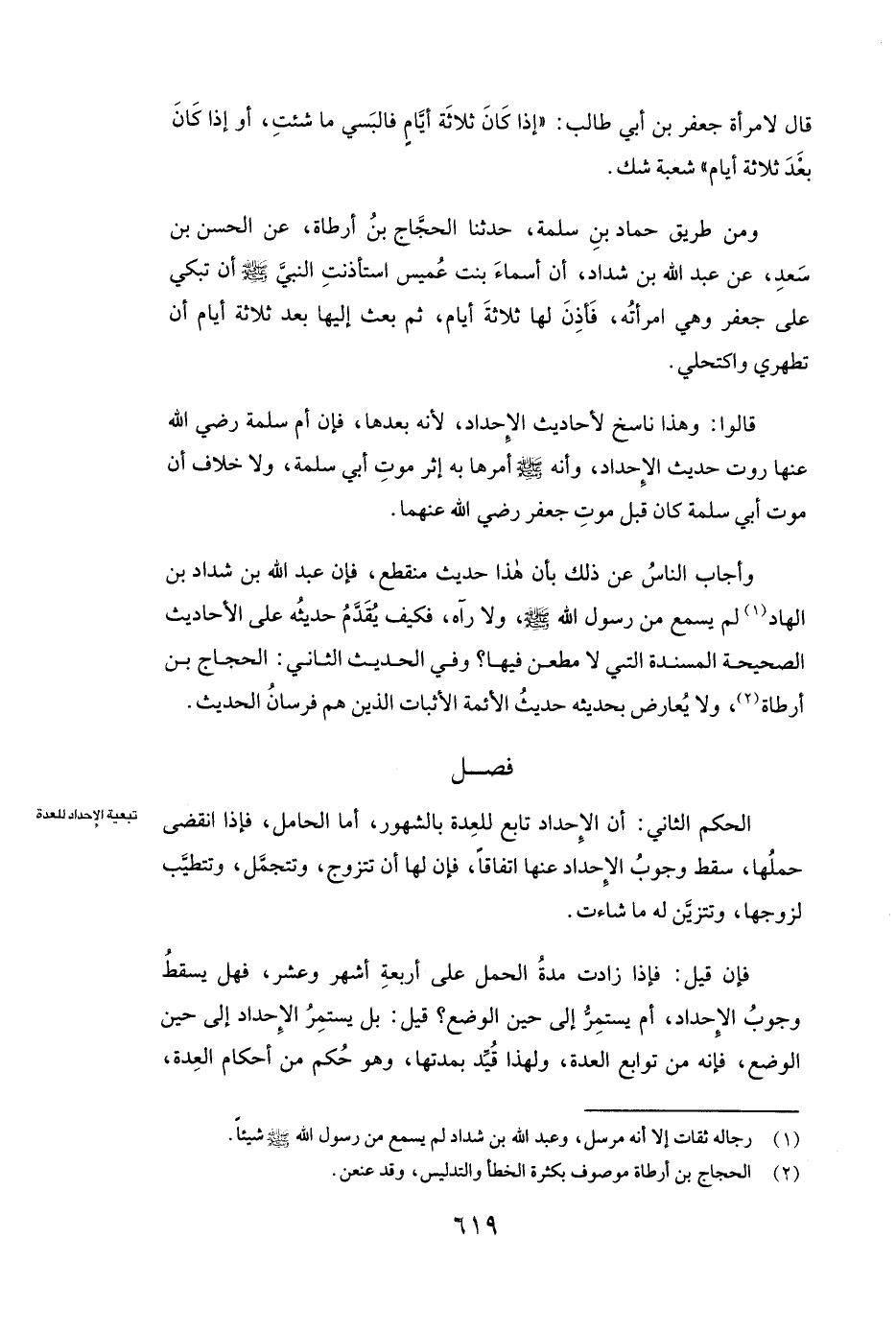 وَمِنْ طَرِيقِ حَمَّادِ بْنِ سَلَمَةَ حَدَّثَنَا الْحَجَّاجُ بْنُ أَرْطَاةَ، عَنِ الْحَسَنِ بْنِ سَعْدٍ، عَنْ عَبْدِ اللَّهِ بْنِ شَدَّادٍ ( «أَنَّ أسماء بنت عميس اسْتَأْذَنَتِ النَّبِيَّ صَلَّى اللَّهُ عَلَيْهِ وَسَلَّمَ أَنْ تَبْكِيَ عَلَى جعفر وَهِيَ امْرَأَتُهُ فَأَذِنَ لَهَا ثَلَاثَةَ أَيَّامٍ، ثُمَّ بَعَثَ إِلَيْهَا بَعْدَ ثَلَاثَةِ أَيَّامٍ أَنْ تَطَهَّرِي وَاكْتَحِلِي» )