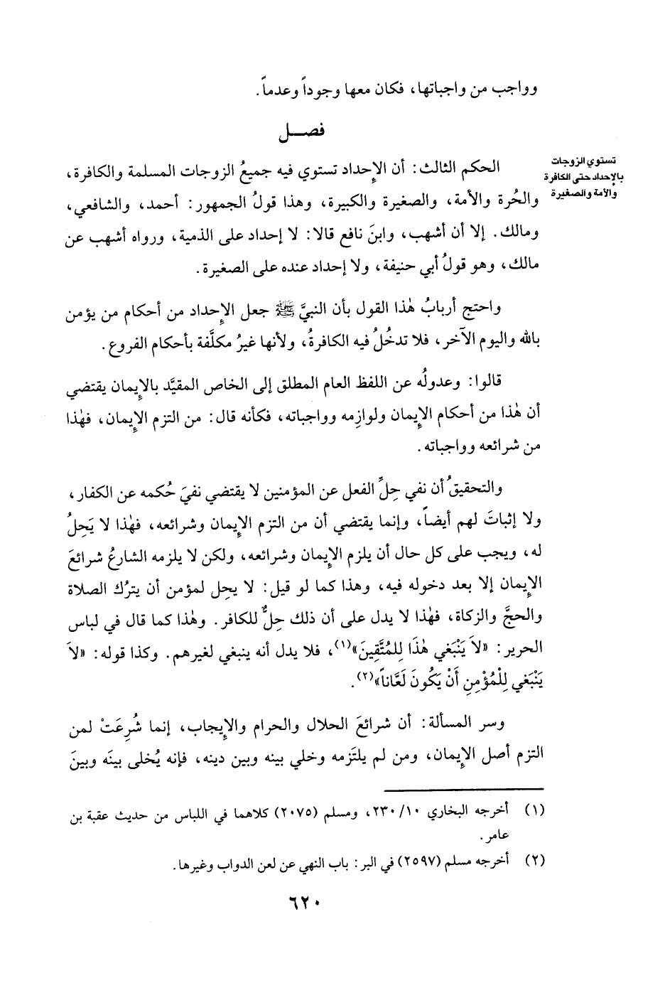 فَصْلٌ. 50 الْحُكْمُ الثَّالِثُ أَنَّ الْإِحْدَادَ تَسْتَوِي فِيهِ جَمِيعُ الزَّوْجَاتِ الْمُسْلِمَةِ وَالْكَافِرَةِ وَالْحُرَّةِ وَالْأَمَةِ الصَّغِيرَةِ وَالْكَبِيرَةِ، وَهَذَا قَوْلُ الْجُمْهُورِ أحمد، وَالشَّافِعِيِّ ومالك. إِلَّا (أَنَّ أشهب وابن نافع قَالَا لَا إِحْدَادَ عَلَى الذِّمِّيَّةِ) رَوَاهُ أشهب، عَنْ مالك، وَهُوَ قَوْلُ أبي حنيفة، وَلَا إِحْدَادَ عِنْدَهُ عَلَى الصَّغِيرَةِ.