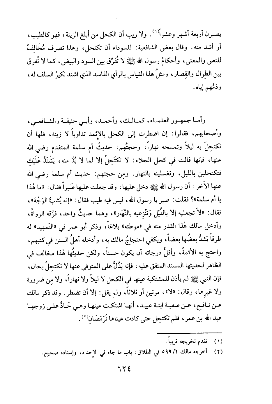 وَمِنْ حُجَّتِهِمْ حَدِيثُ أم سلمة رَضِيَ اللَّهُ عَنْهَا الْآخَرُ أَنَّ رَسُولَ اللَّهِ صَلَّى اللَّهُ عَلَيْهِ وَسَلَّمَ دَخَلَ عَلَيْهَا، وَقَدْ جَعَلَتْ عَلَيْهَا صَبْرًا فَقَالَ ( «مَا هَذَا يَا أم سلمة؟ فَقُلْتُ: صَبْرٌ يَا رَسُولَ اللَّهِ لَيْسَ فِيهِ طِيبٌ فَقَالَ: إِنَّهُ يُشِبُّ الْوَجْهَ فَقَالَ: " لَا تَجْعَلِيهِ إِلَّا بِاللَّيْلِ وَتَنْزِعِيهِ بِالنَّهَارِ» ) وَهُمَا حَدِيثٌ وَاحِدٌ فَرَّقَهُ الرُّوَاةُ، وَأَدْخَلَ مالك هَذَا الْقَدْرَ مِنْهُ فِي " مُوَطَّئِهِ " بَلَاغًا، وَذَكَرَ أبو عمر فِي " التَّمْهِيدِ " لَهُ طُرُقًا يَشُدُّ بَعْضُهَا بَعْضًا، وَيَكْفِي احْتِجَاجُ مالك بِهِ، وَأَدْخَلَهُ أَهْلُ السُّنَنِ فِي كُتُبِهِمْ، وَاحْتَجَّ بِهِ الْأَئِمَّةُ، وَأَقَلُّ دَرَجَاتِهِ أَنْ يَكُونَ حَسَنًا، وَلَكِنْ حَدِيثُهَا هَذَا مُخَالِفٌ فِي الظَّاهِرِ لِحَدِيثِهَا الْمُسْنَدِ الْمُتَّفَقِ عَلَيْهِ، فَإِنَّهُ يَدُلُّ عَلَى الْمُتَوَفَّى عَنْهَا لَا تَكْتَحِلُ بِحَالٍ، فَإِنَّ النَّبِيَّ صَلَّى اللَّهُ عَلَيْهِ وَسَلَّمَ لَمْ يَأْذَنْ لِلْمُشْتَكِيَةِ عَيْنَهَا فِي الْكُحْلِ لَا لَيْلًا، وَلَا نَهَارًا، وَلَا مِنْ ضَرُورَةٍ، وَلَا غَيْرِهَا، وَقَالَ " لَا " مَرَّتَيْنِ، أَوْ ثَلَاثًا، وَلَمْ يَقُلْ إِلَّا أَنْ تُضْطَرَّ.