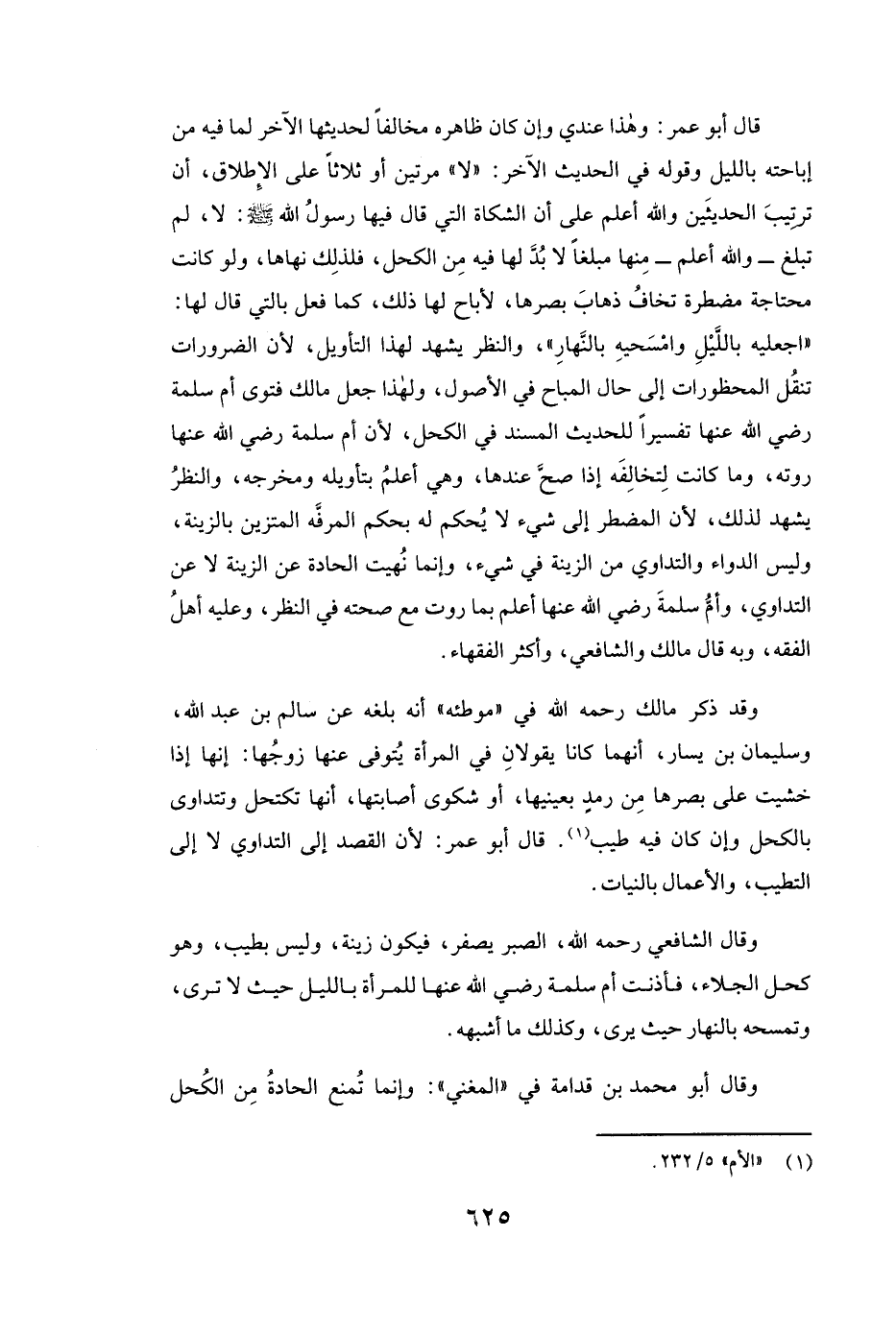 قَالَ أبو عمر: وَهَذَا عِنْدِي وَإِنْ كَانَ ظَاهِرُهُ مُخَالِفًا لِحَدِيثِهَا الْآخَرِ لِمَا فِيهِ مِنْ إِبَاحَتِهِ بِاللَّيْلِ وَقَوْلِهِ فِي الْحَدِيثِ الْآخَرِ " لَا " مَرَّتَيْنِ، أَوْ ثَلَاثًا عَلَى الْإِطْلَاقِ أَنَّ تَرْتِيبَ الْحَدِيثَيْنِ وَاللَّهُ أَعْلَمُ عَلَى أَنَّ الشَّكَاةَ الَّتِي قَالَ فِيهَا رَسُولُ اللَّهِ صَلَّى اللَّهُ عَلَيْهِ وَسَلَّمَ لَا لَمْ تَبْلُغْ - وَاللَّهُ أَعْلَمُ - مِنْهَا مَبْلَغًا لَا بُدَّ لَهَا فِيهِ مِنَ الْكُحْلِ؛ فَلِذَلِكَ نَهَاهَا، وَلَوْ كَانَتْ مُحْتَاجَةً مُضْطَرَّةً تَخَافُ ذَهَابَ بَصَرِهَا لَأَبَاحَ لَهَا ذَلِكَ كَمَا فَعَلَ بِالَّتِي قَالَ لَهَا: ( «اجْعَلِيهِ بِاللَّيْلِ وَامْسَحِيهِ بِالنَّهَارِ» ) وَالنَّظَرُ يَشْهَدُ لِهَذَا التّأْوِيلِ؛ لِأَنَّ الضَّرُورَاتِ تَنْقُلُ الْمَحْظُورَاتِ إِلَى حَالِ الْمُبَاحِ فِي الْأُصُولِ، وَلِهَذَا جَعَلَ مالك فَتْوَى أم سلمة رَضِيَ اللَّهُ عَنْهَا تَفْسِيرًا لِلْحَدِيثِ الْمُسْنَدِ فِي الْكُحْلِ؛ لِأَنَّ أم سلمة رَضِيَ اللَّهُ عَنْهَا رَوَتْهُ وَمَا كَانَتْ لِتُخَالِفَهُ إِذَا صَحَّ عِنْدَهَا وَهِيَ أَعْلَمُ بِتَأْوِيلِهِ وَمَخْرَجِهِ، وَالنَّظَرُ يَشْهَدُ لِذَلِكَ؛ لِأَنَّ الْمُضْطَرَّ إِلَى شَيْءٍ لَا يُحْكَمُ لَهُ بِحُكْمِ الْمُرَفَّهِ الْمُتَزَيِّنِ بِالزِّينَةِ، وَلَيْسَ الدَّوَاءُ وَالتَّدَاوِي مِنَ الزِّينَةِ فِي شَيْءٍ، وَإِنَّمَا نُهِيَتِ الْحَادَّةُ عَنِ الزِّينَةِ لَا عَنِ التَّدَاوِي، وأم سلمة رَضِيَ اللَّهُ عَنْهَا أَعْلَمُ بِمَا رَوَتْ مَعَ صِحَّتِهِ فِي النَّظَرِ، وَعَلَيْهِ أَهْلُ الْفِقْهِ وَبِهِ قَالَ مالك وَالشَّافِعِيُّ وَأَكْثَرُ الْفُقَهَاءِ.